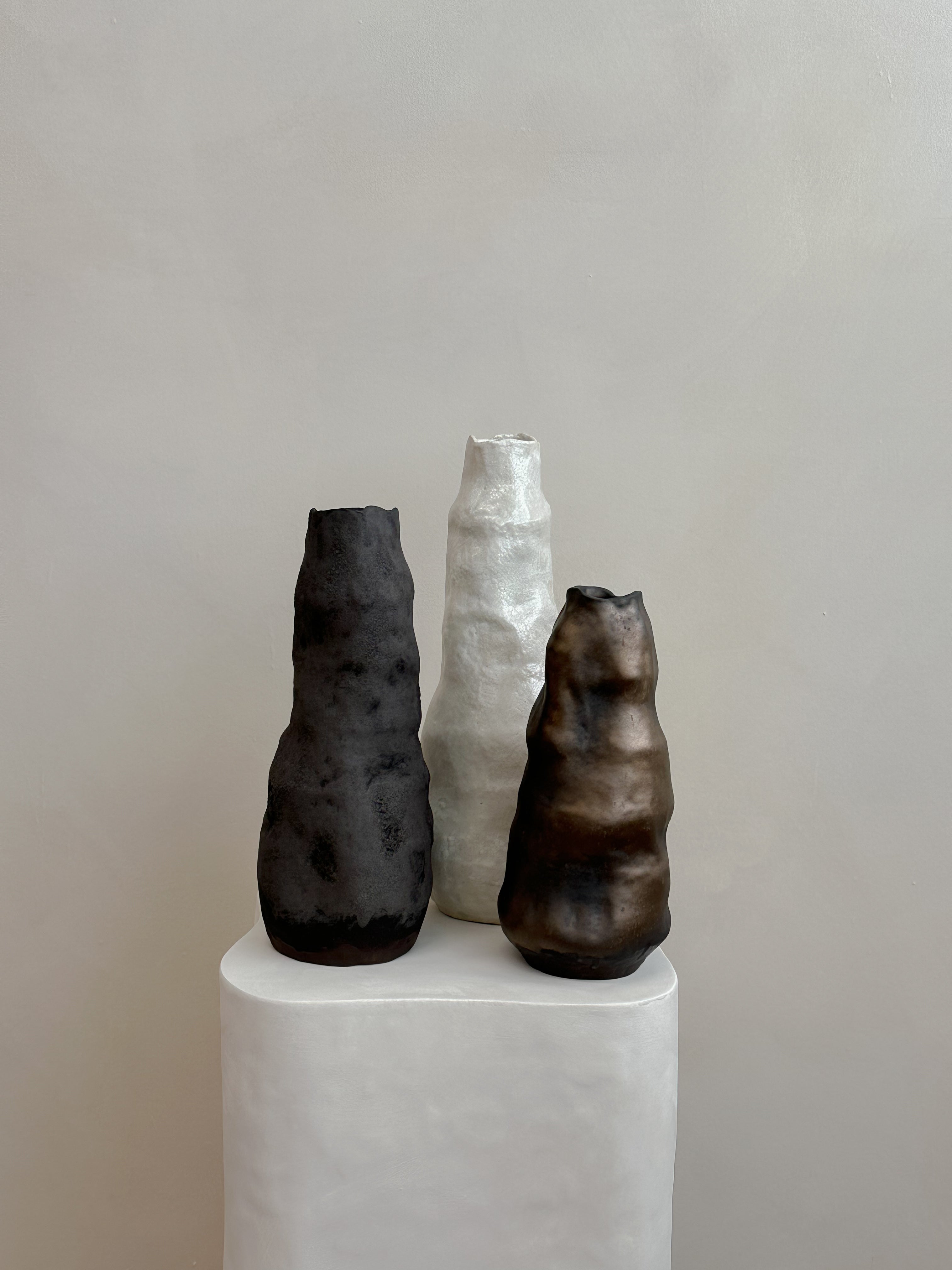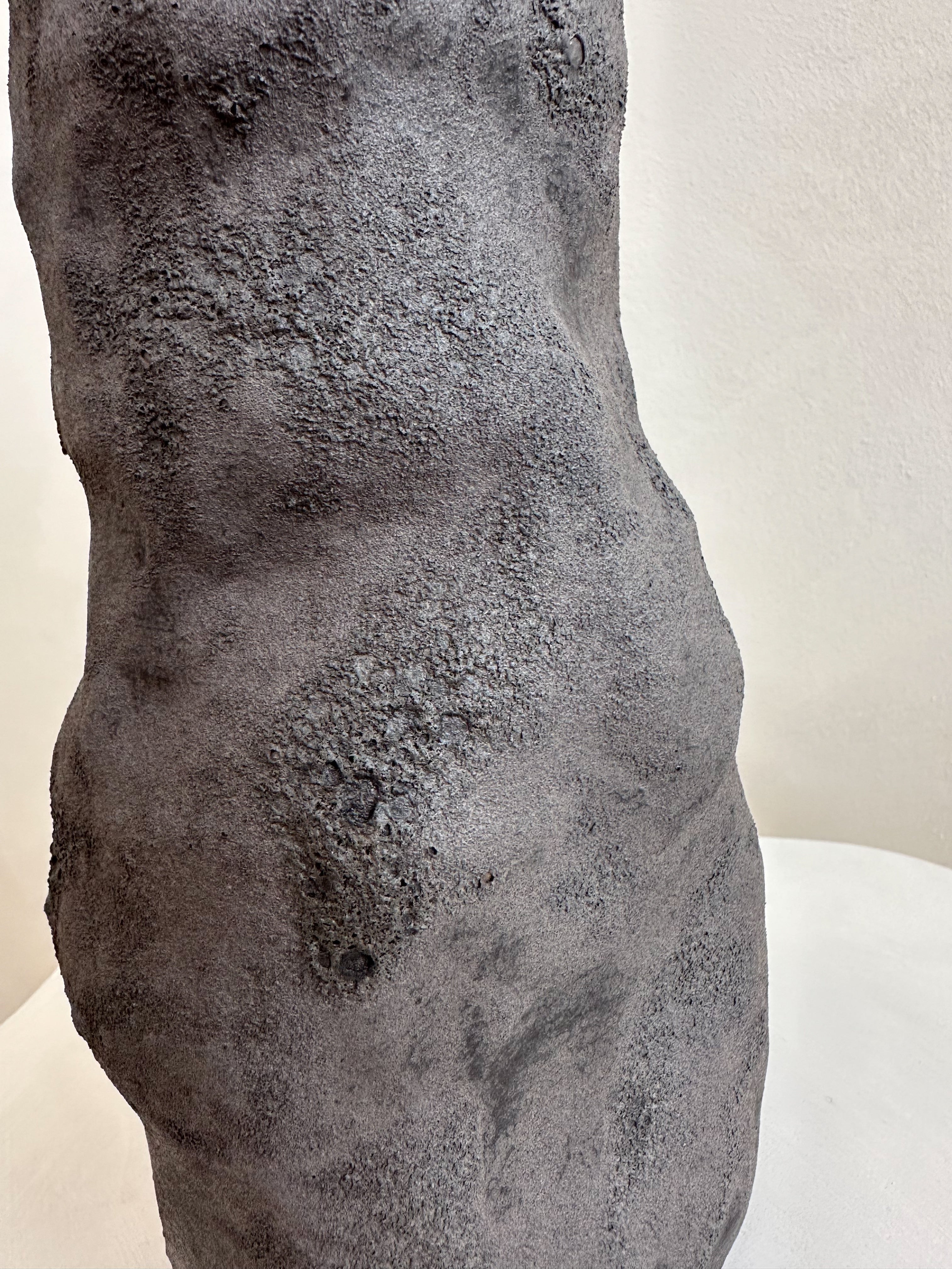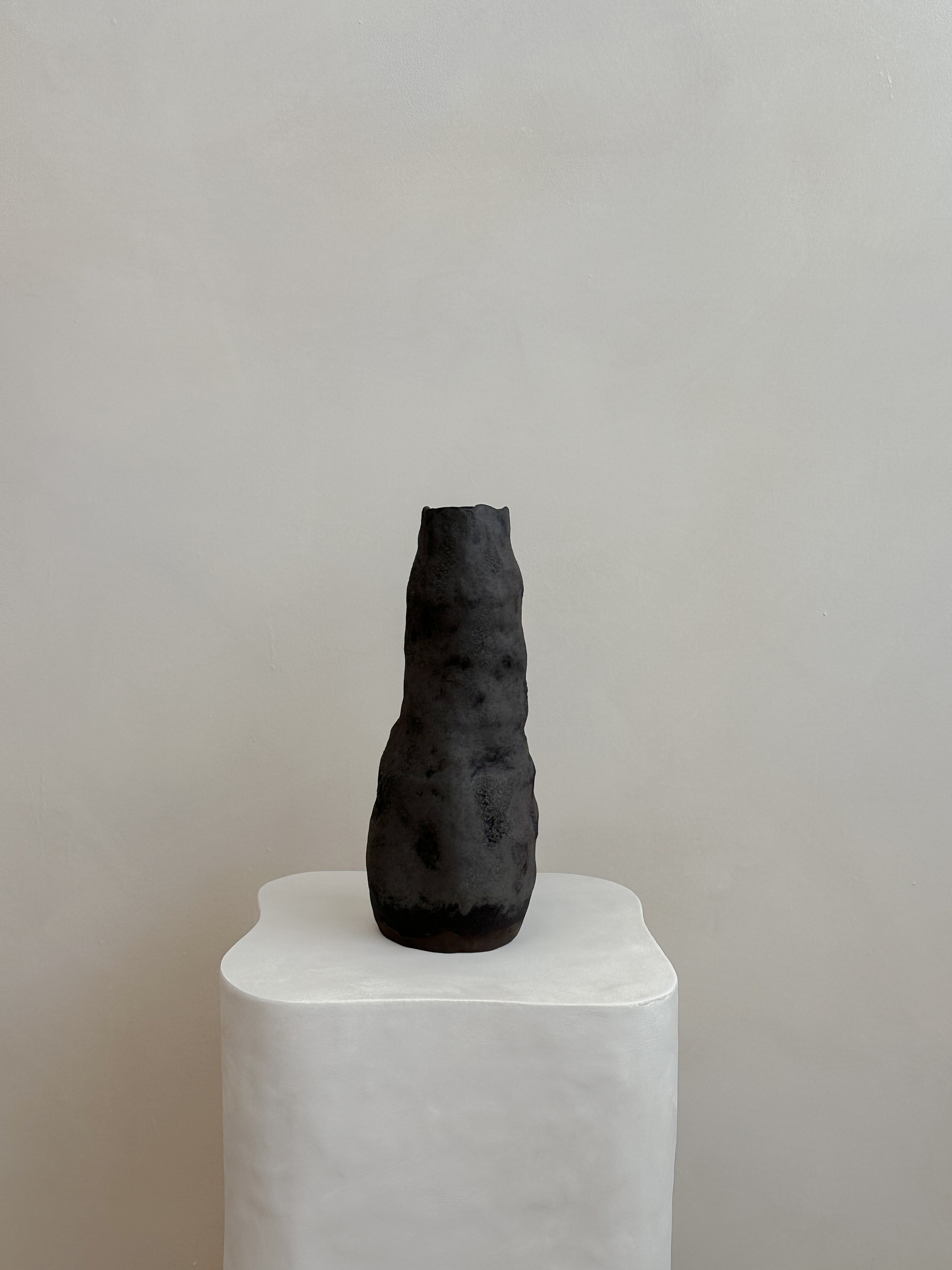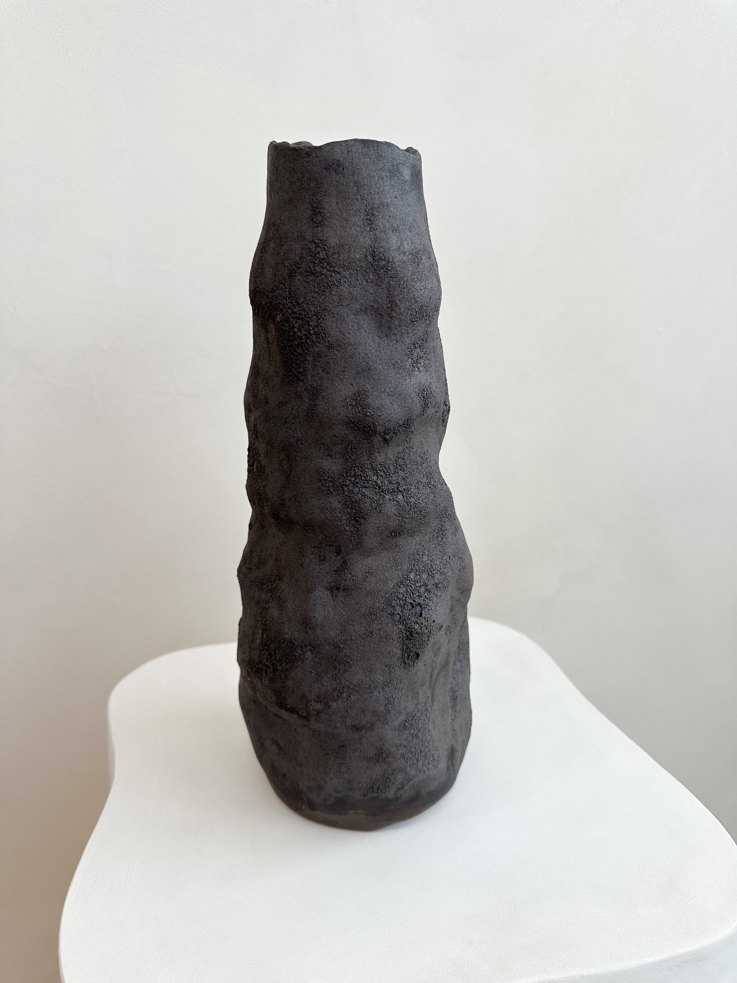 Hand-built using the coiling technique, this sculptural vessel takes inspiration from tubular coral formations found beneath the ocean’s surface. Its organically shaped form is layered with multiple glazes, including a lava-effect finish, to create depth and texture across the matte black surface. The result is a tactile, elemental piece that echoes the raw beauty of volcanic rock and marine life intertwined.