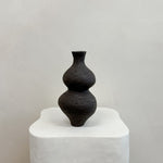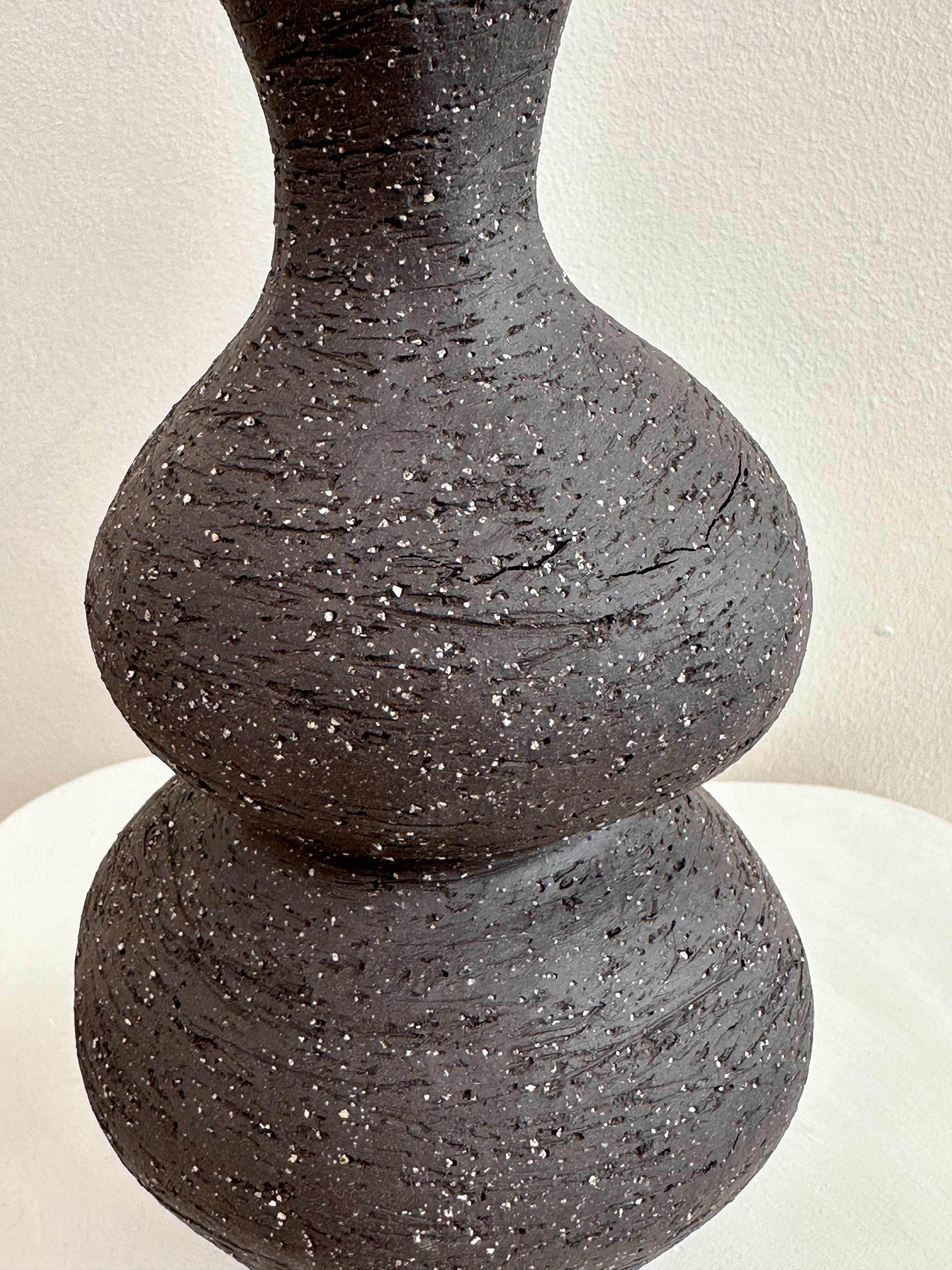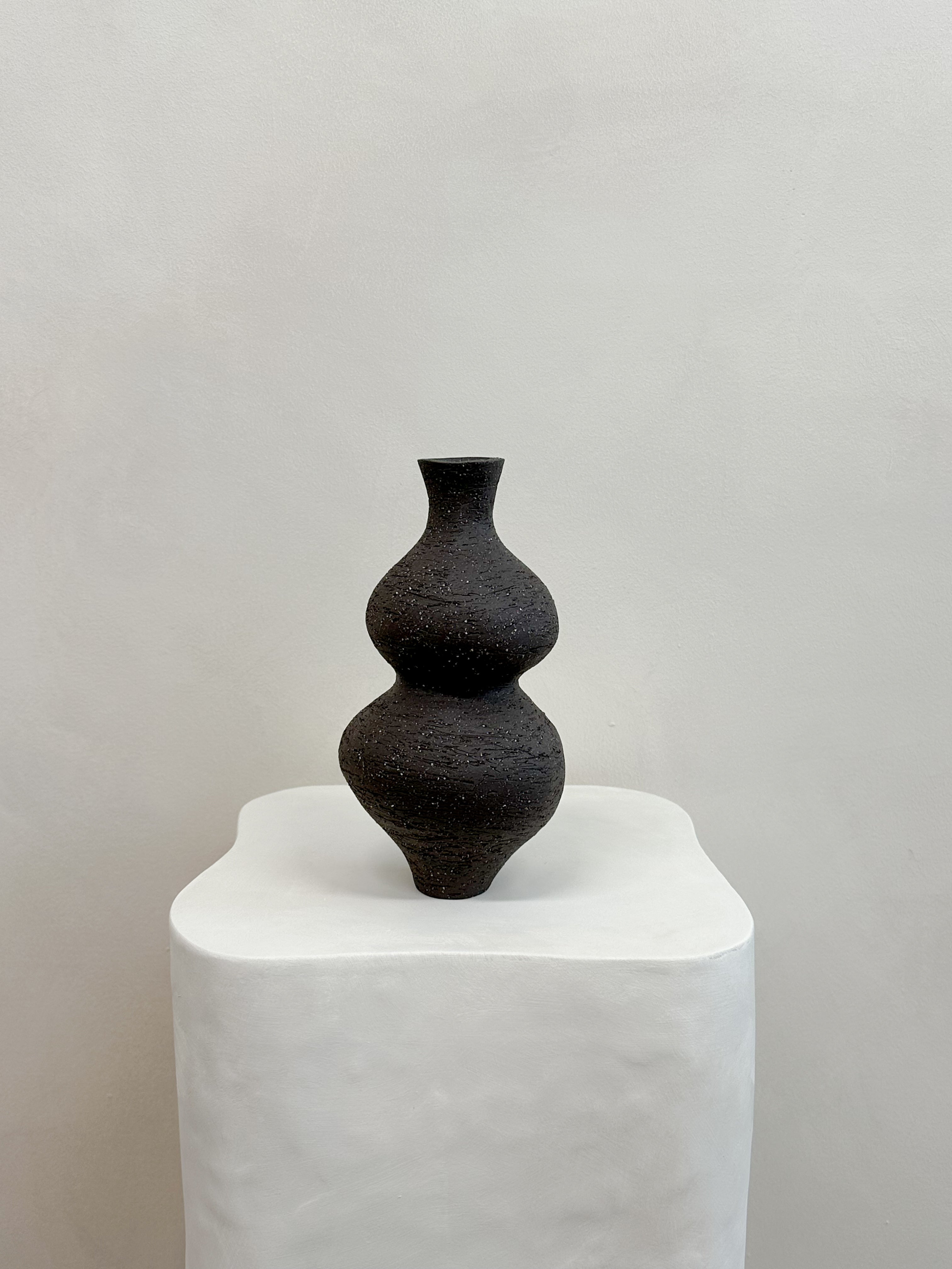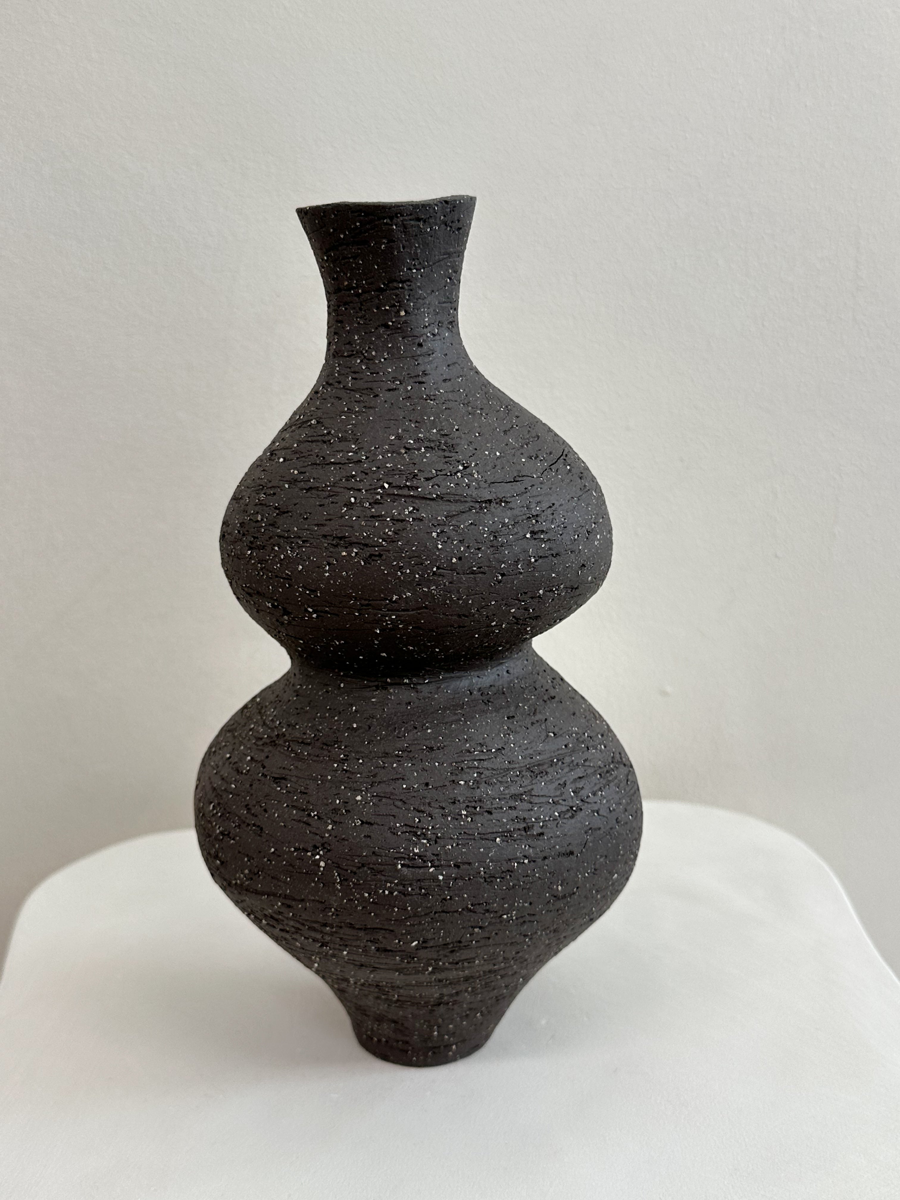 Hand-built with the coiling technique using a richly textured black clay body, this vessel is unglazed, leaving the raw clay texture to shine. The raw black clay shows the white fleck of the grog in the clay and creates a rough texture to touch. The curves of the vessel are inspired by the shape of a woman. There are hairline cracks on the vessel as pictured.
