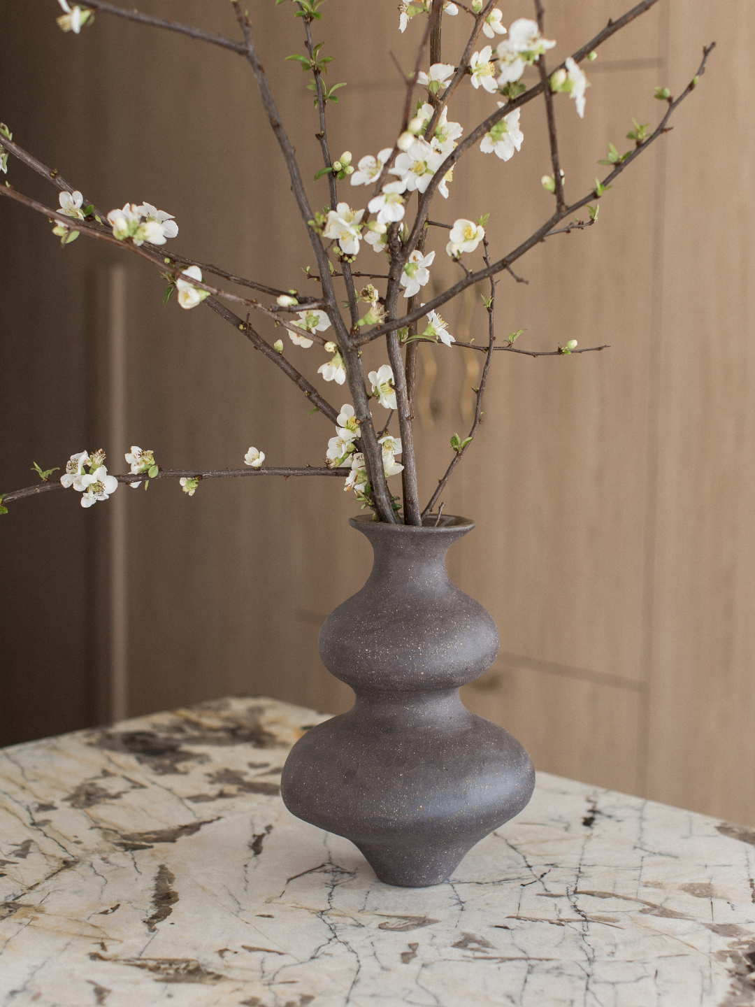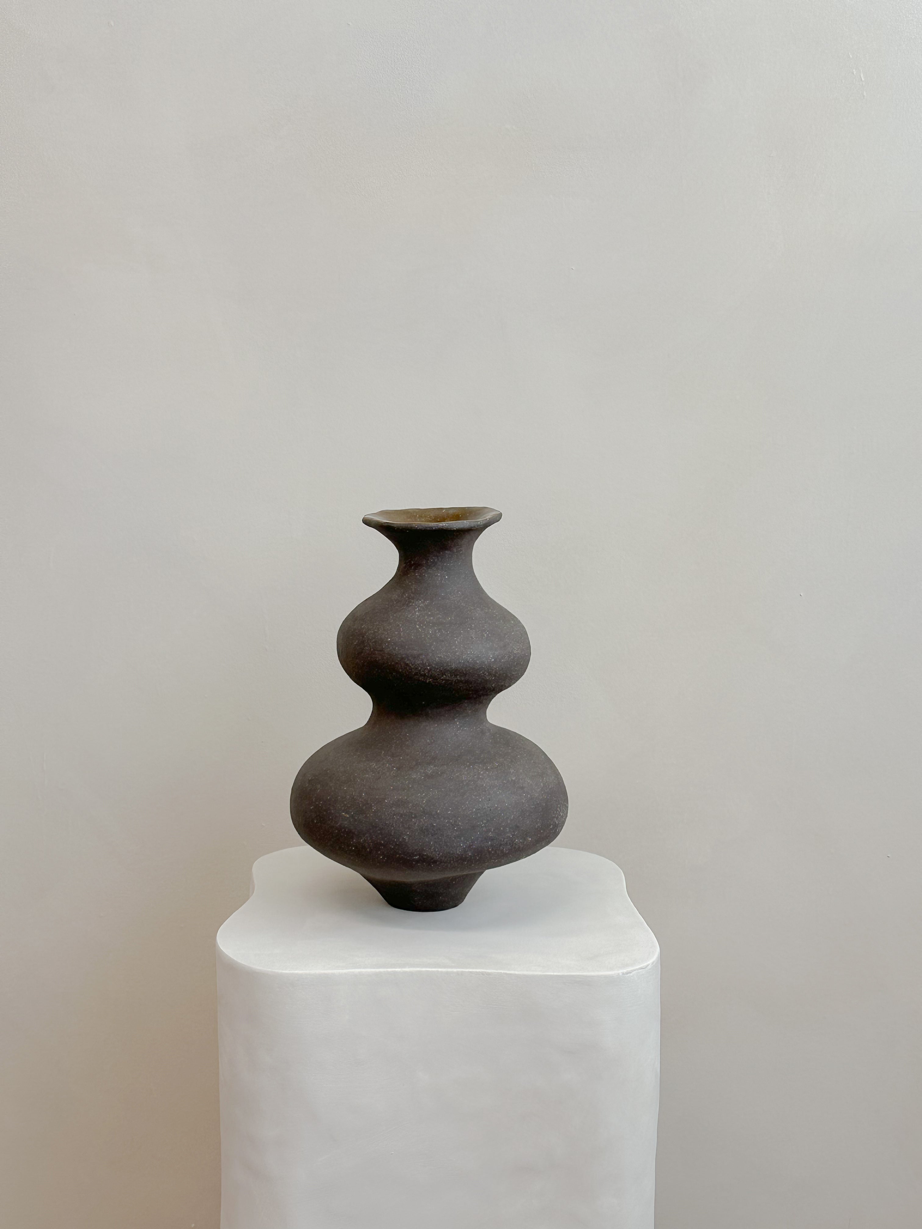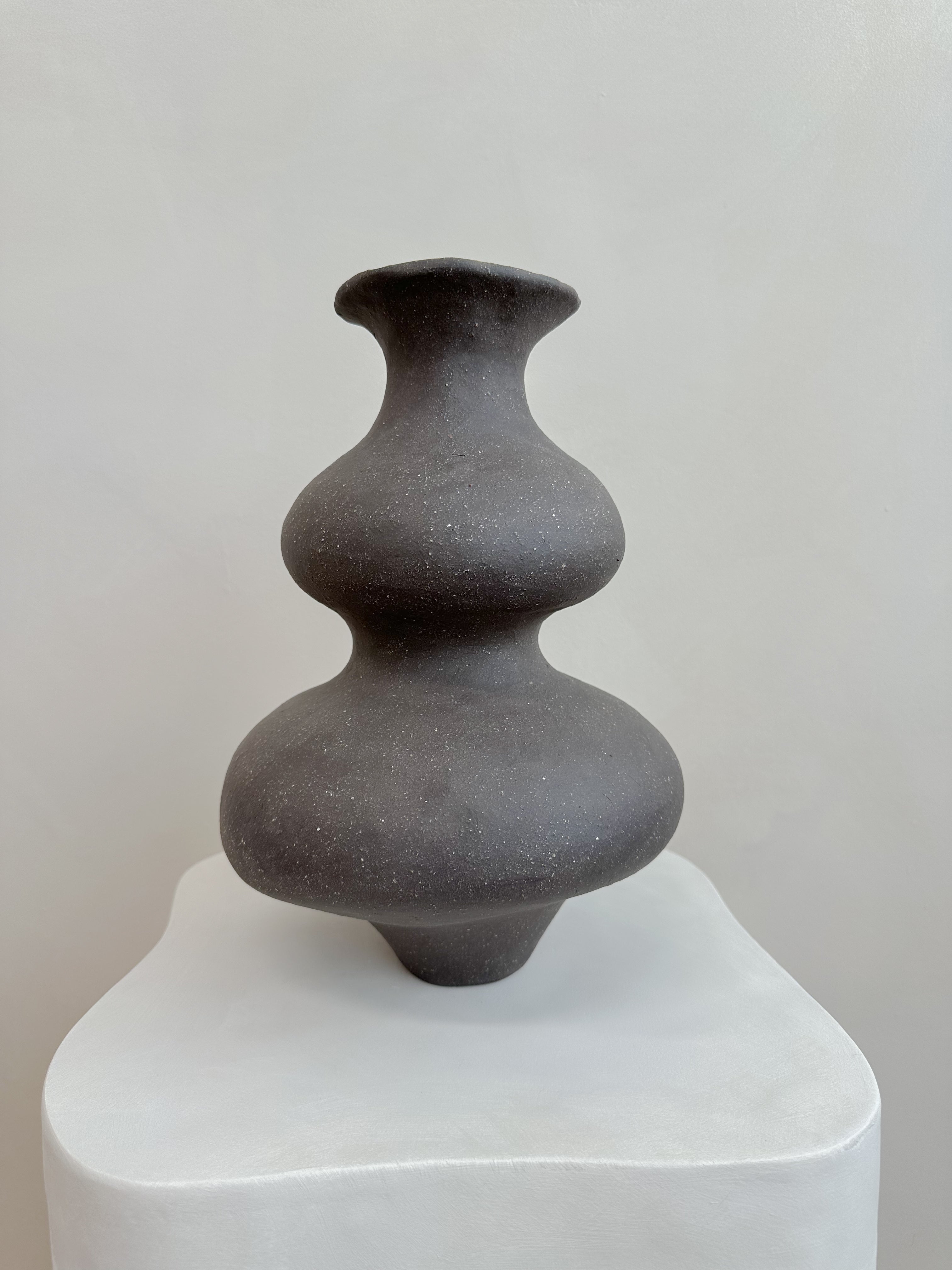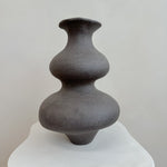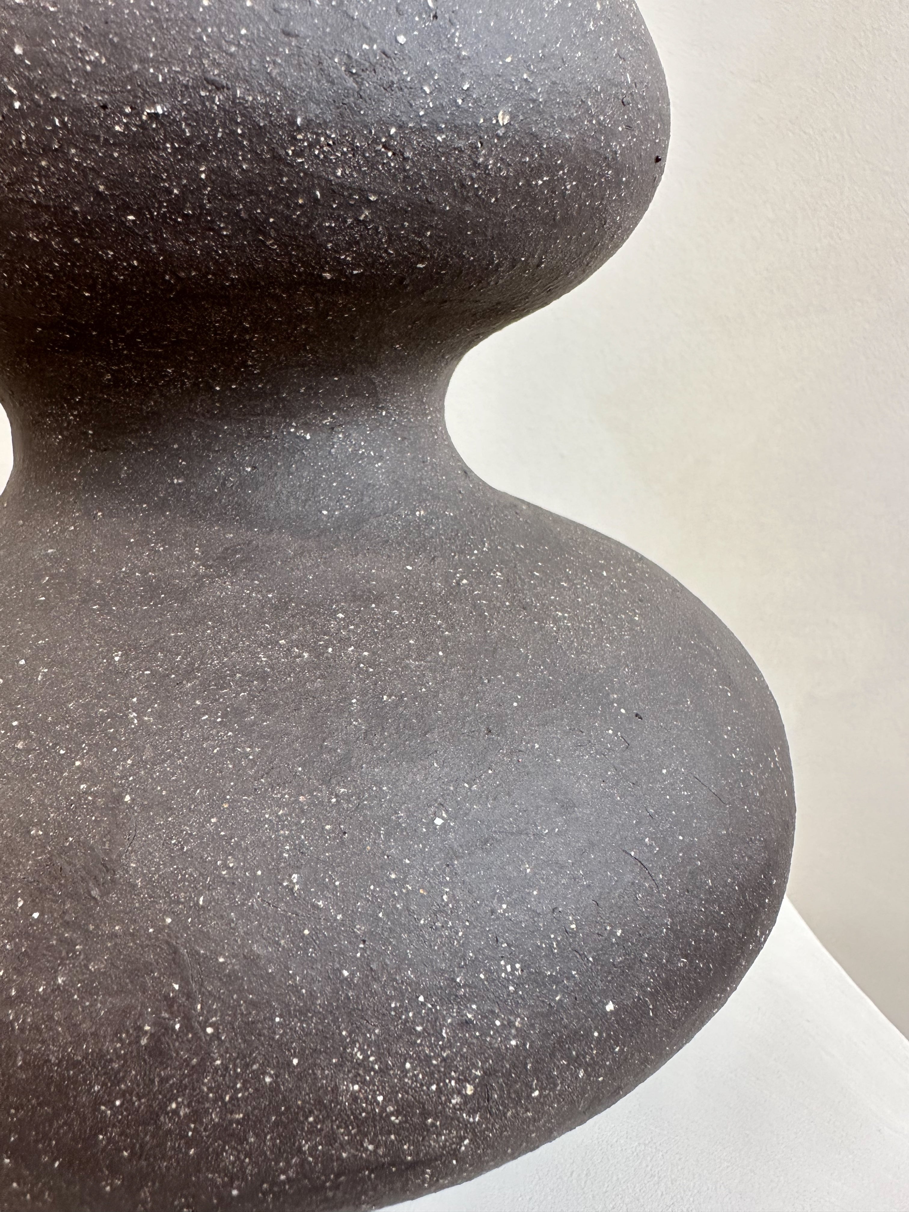 Hand-built using the traditional coiling technique, this sculptural vessel celebrates organic form and material contrast. The interior is glazed for functionality, while the exterior remains raw and natural, revealing the tactile beauty of clay. Formed from a blend of two Australian clay bodies, its surface presents a rich dark chocolate hue softly freckled with white speckles, evoking the textures of weathered stone and earth.