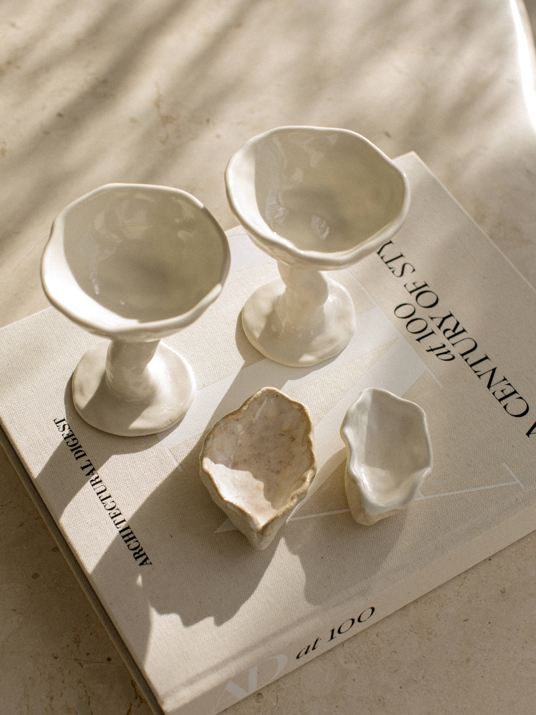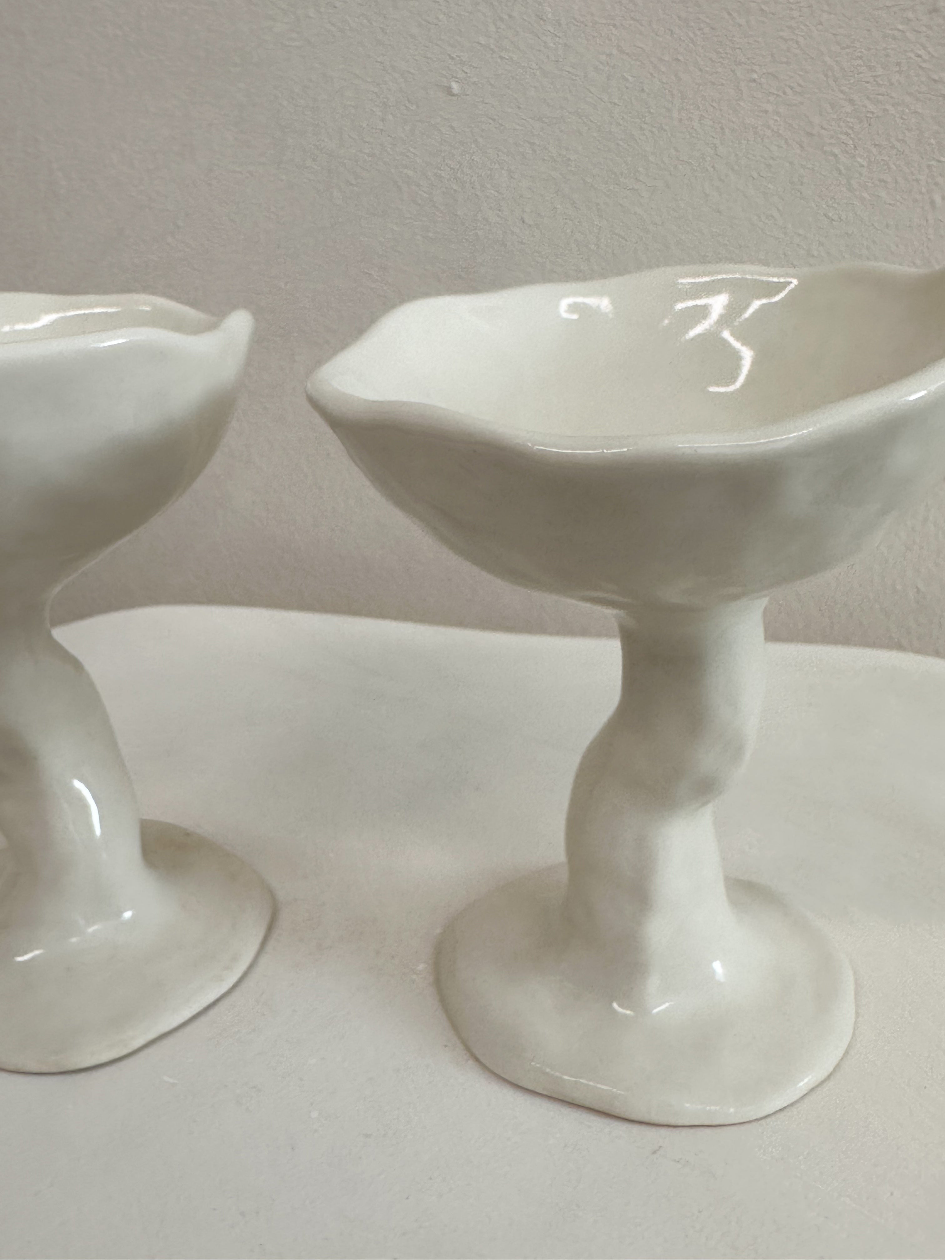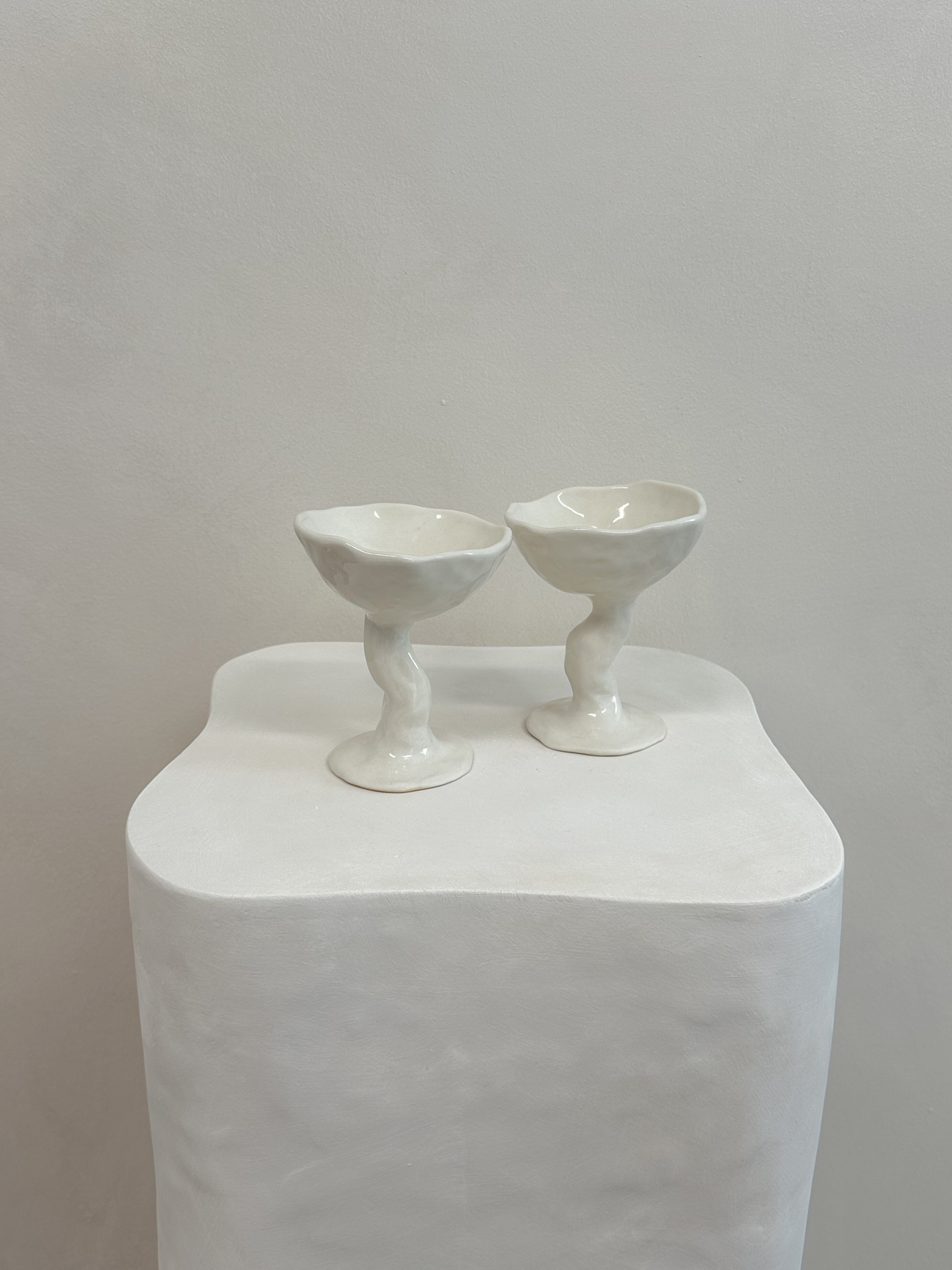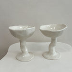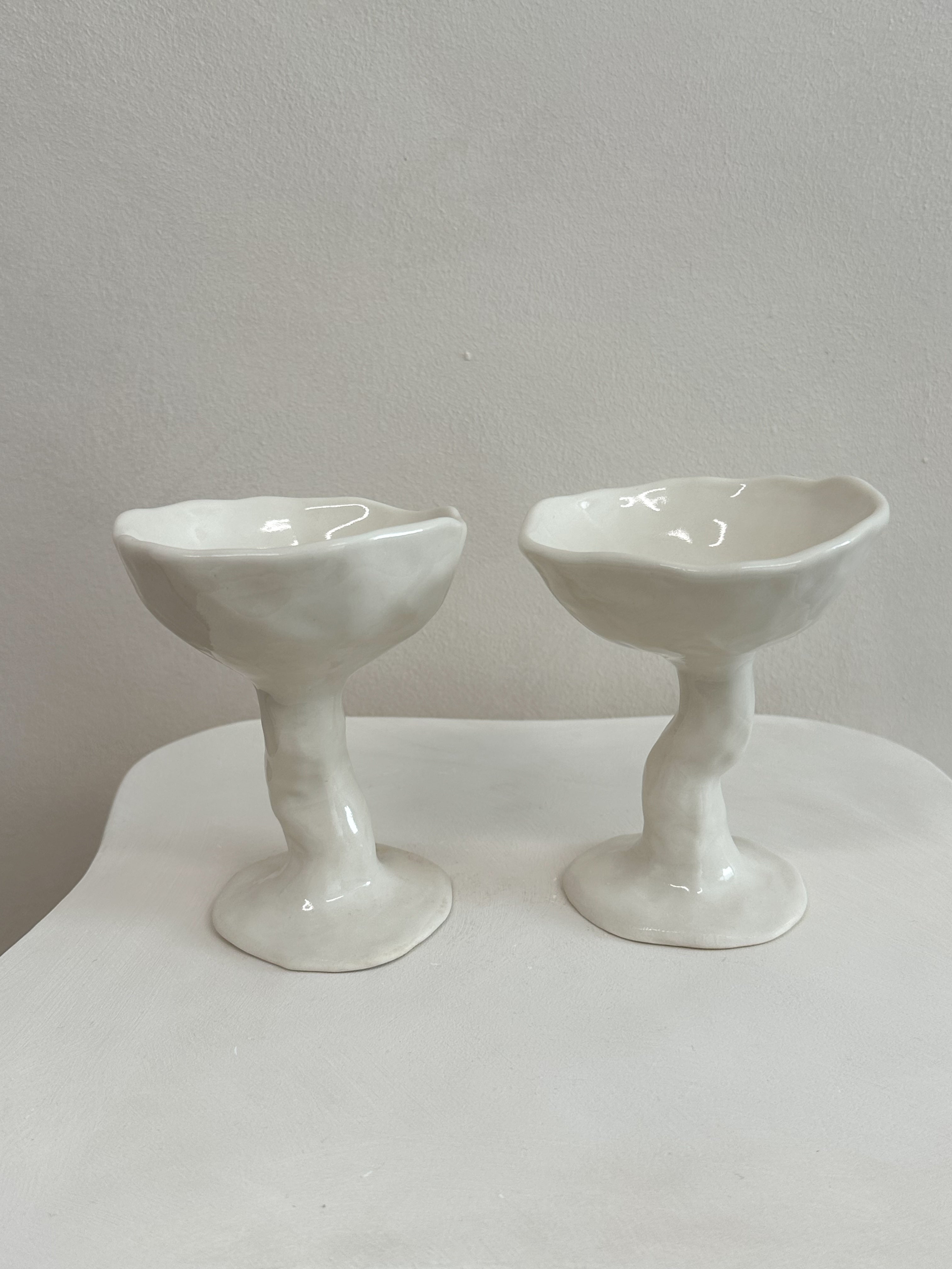 This pair of Ceramic Coupe Glasses have been hand crafted with a smooth off-white clay body and glazed with a clear gloss. Featuring a pinch technique cup and wavy stem, these ceramic glasses will surely romanticise your drinking experience. Perfect for cocktails or mocktails alike. Includes two ceramic coupes.