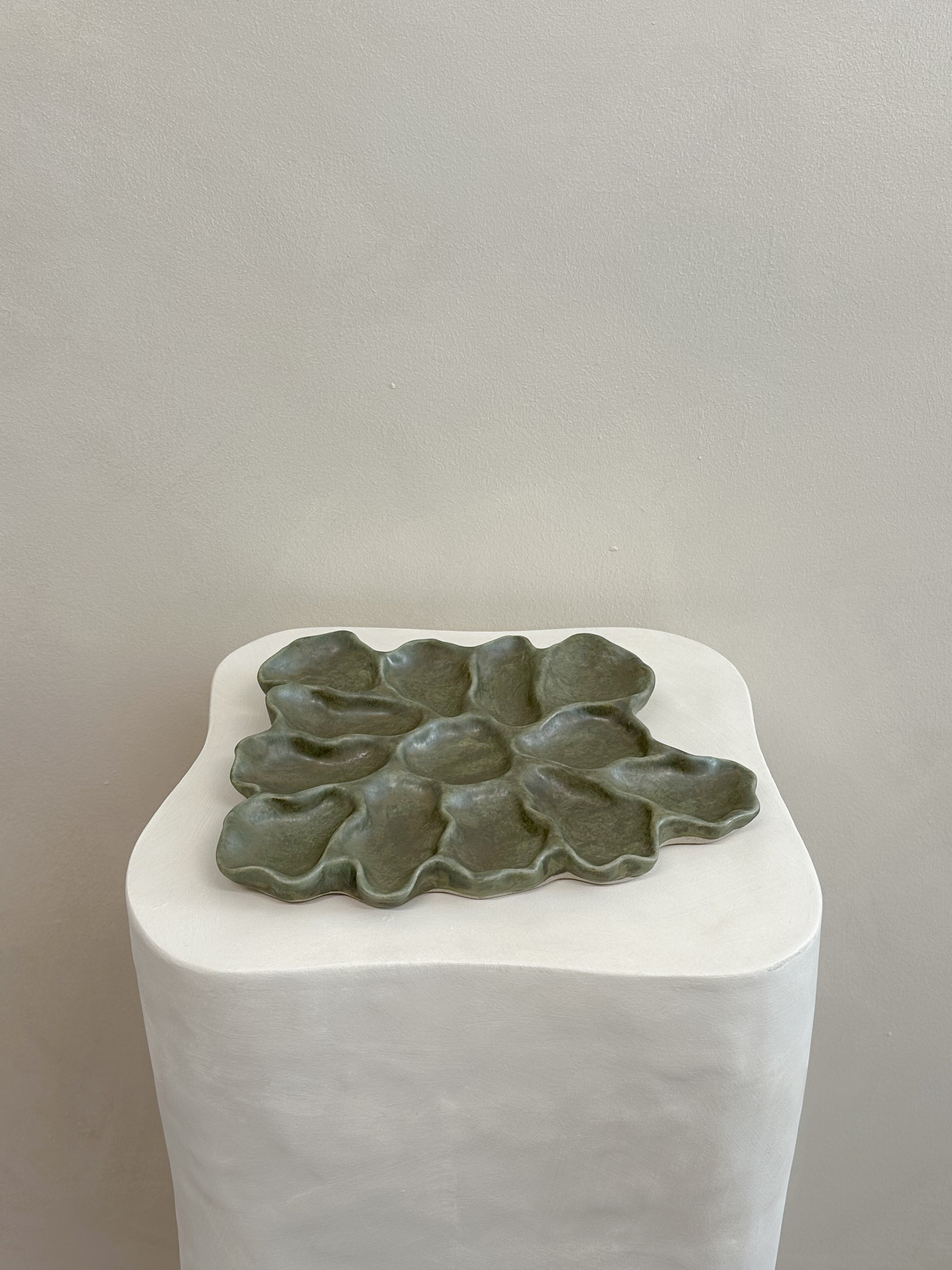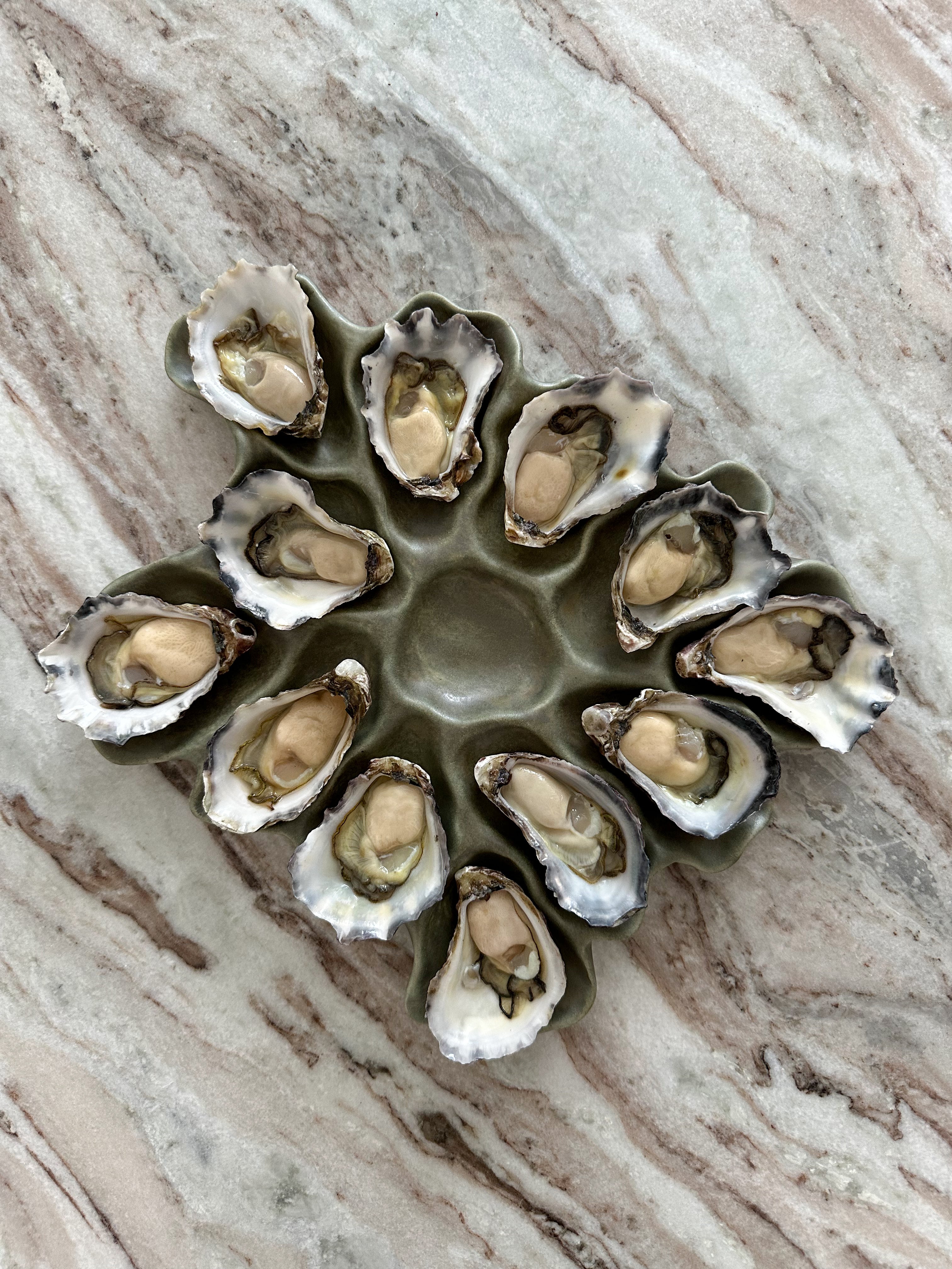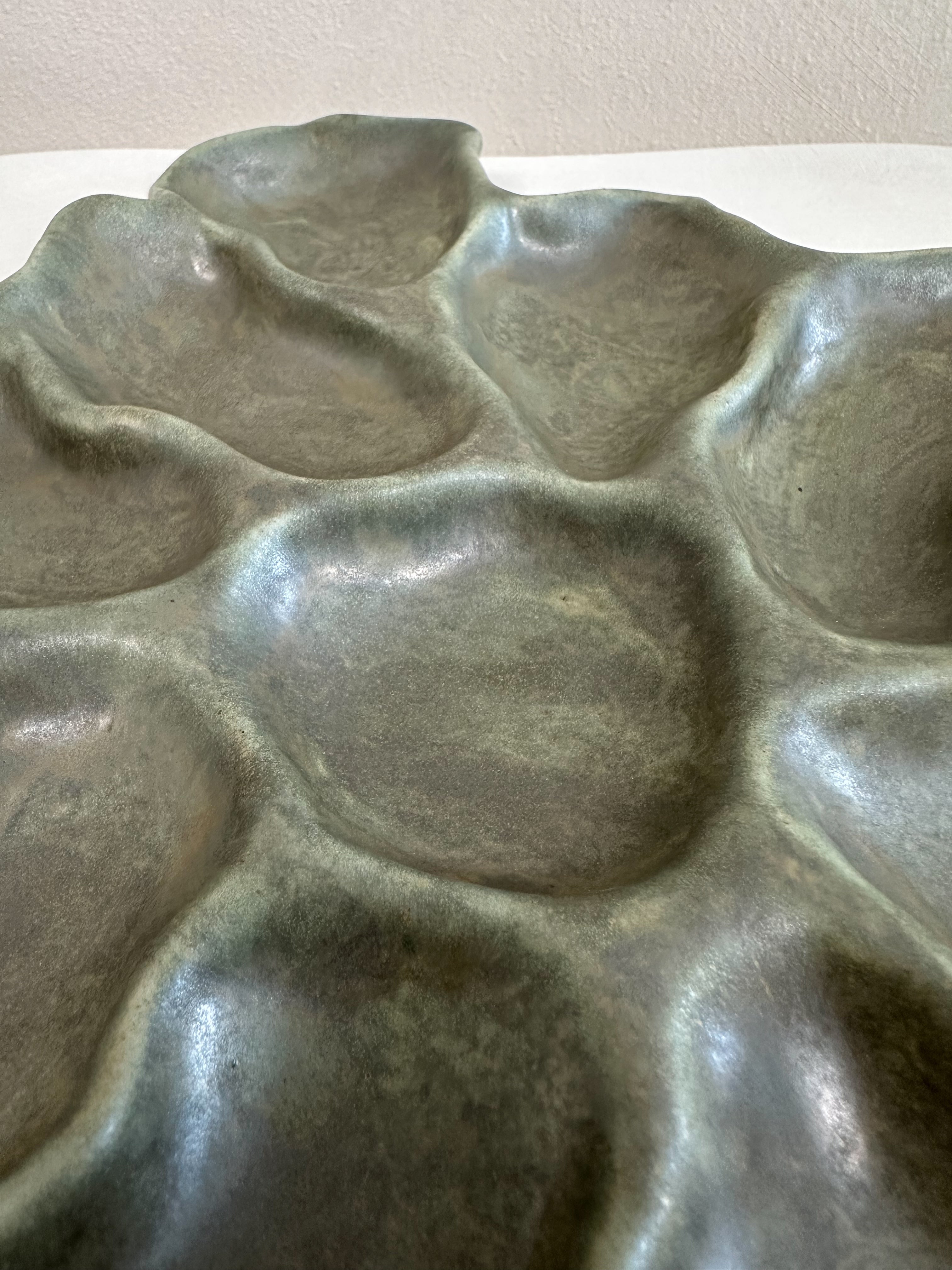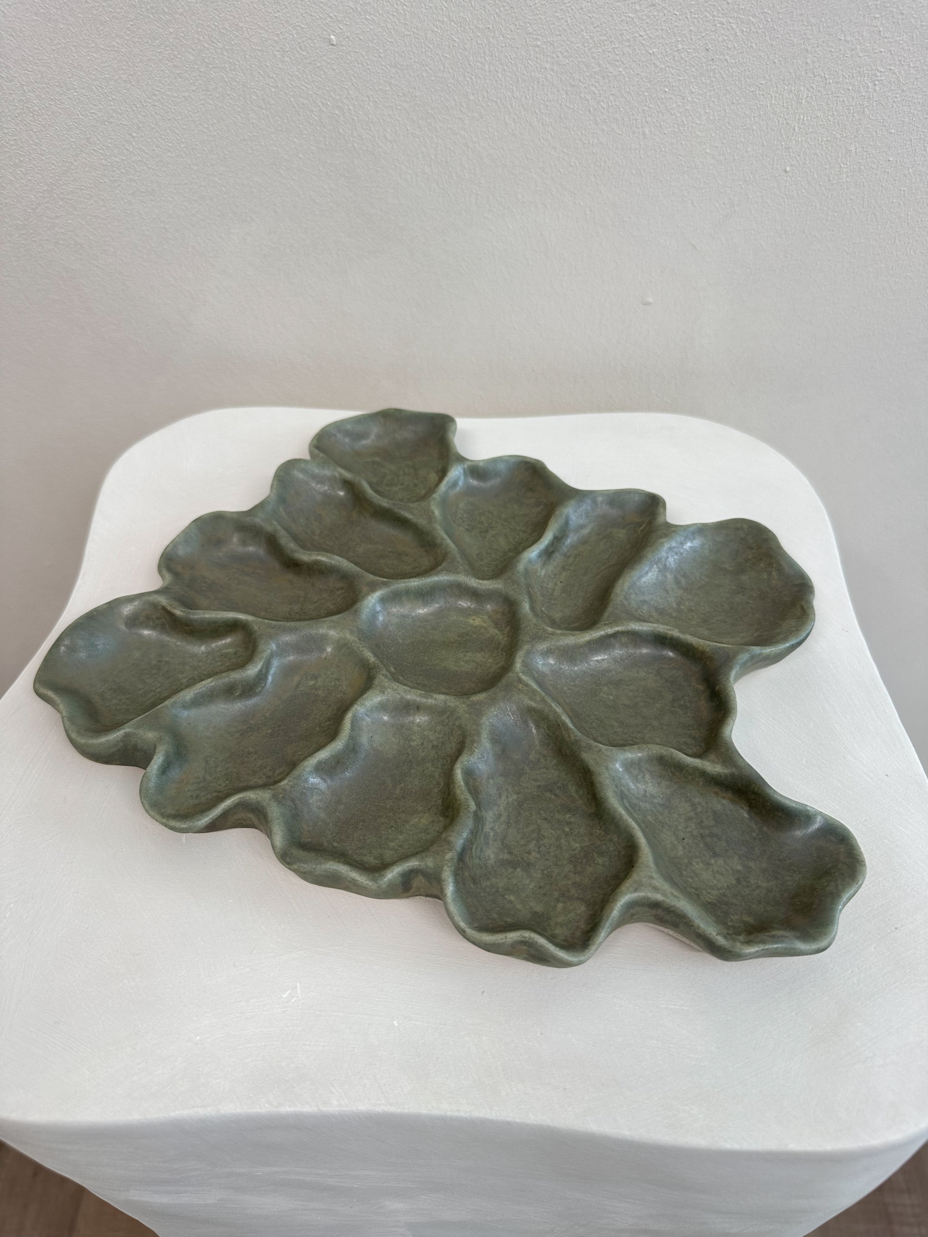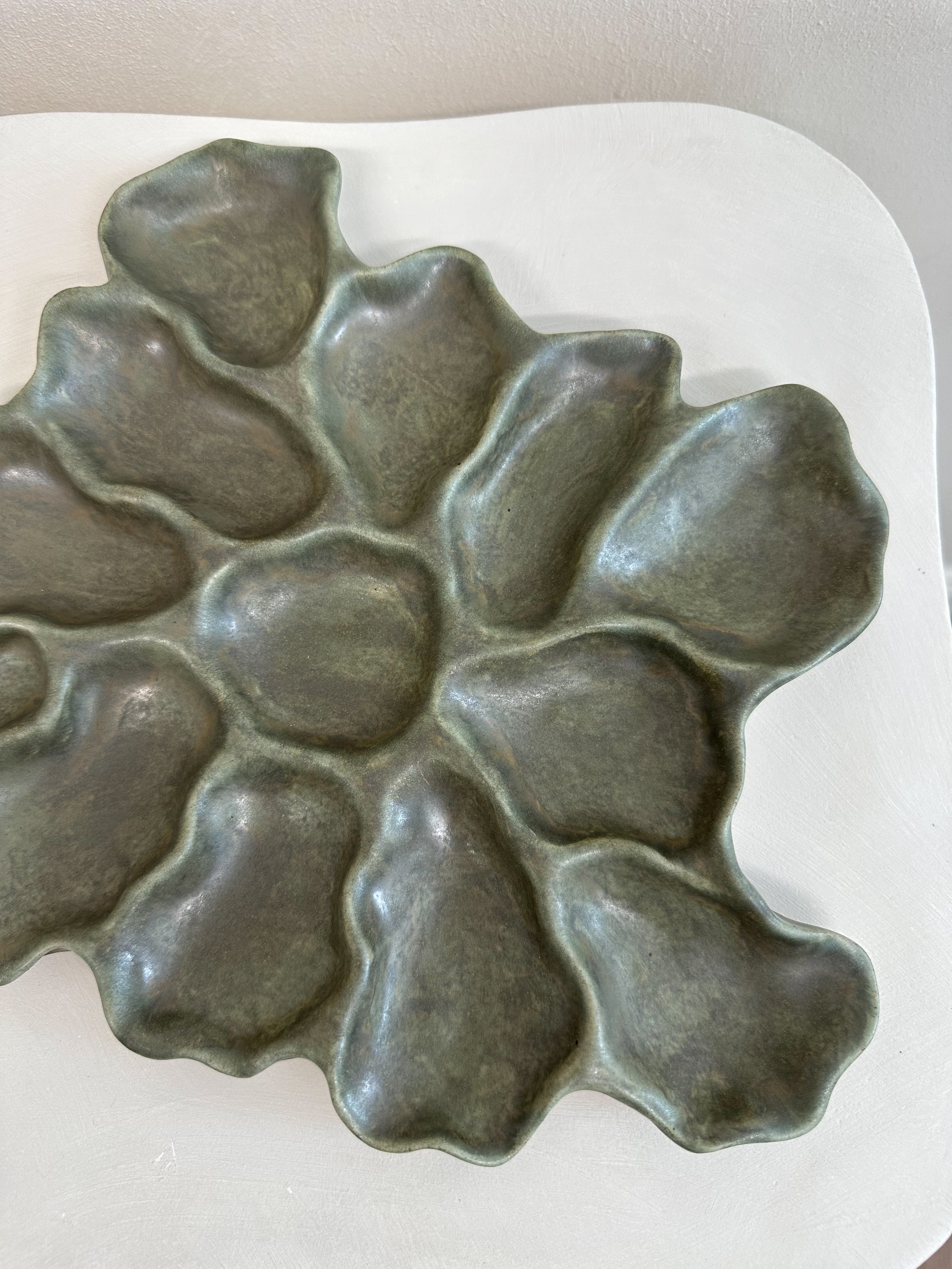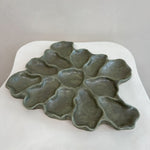 This Harbour Oyster Platter has been hand crafted with a smooth speckled white/grey clay body and glazed with layers of different green glazes, giving deep rich olive tones.