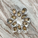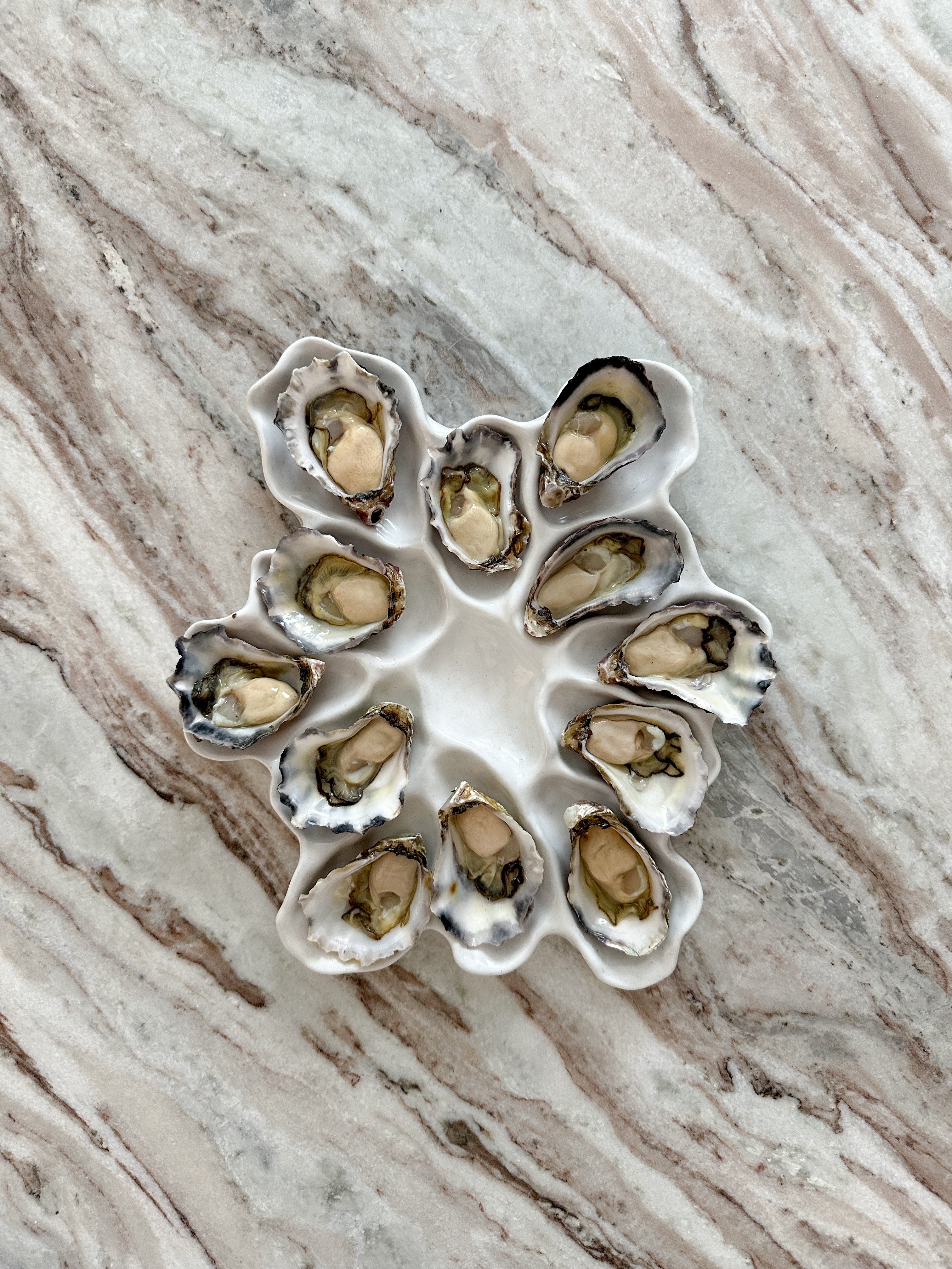 The Harbour Oyster Platter features individually sculpted sections for each oyster, like boats resting in their own moorings. Available in half-dozen and dozen designs, with a central cove for dressing or oyster pearls.