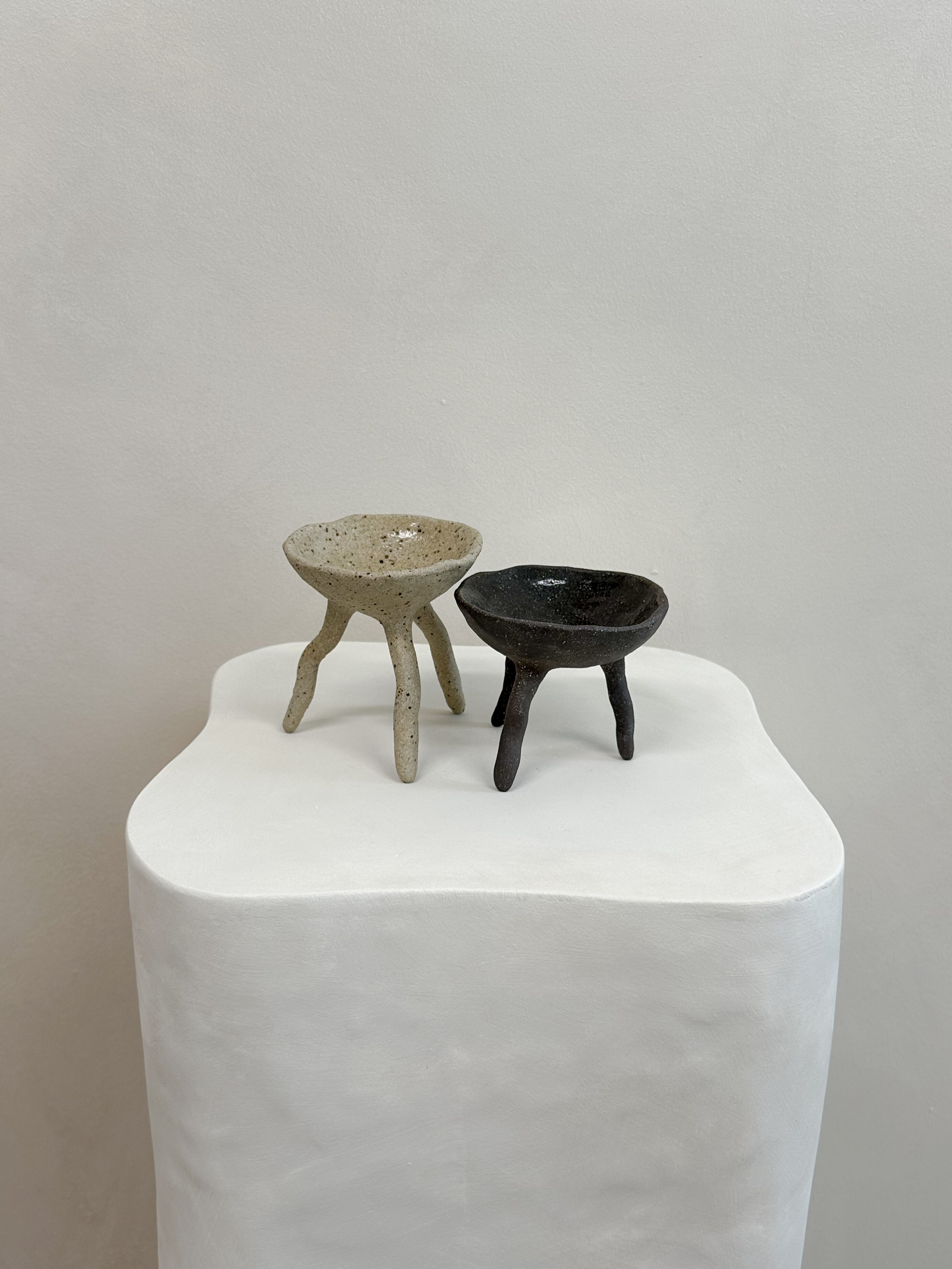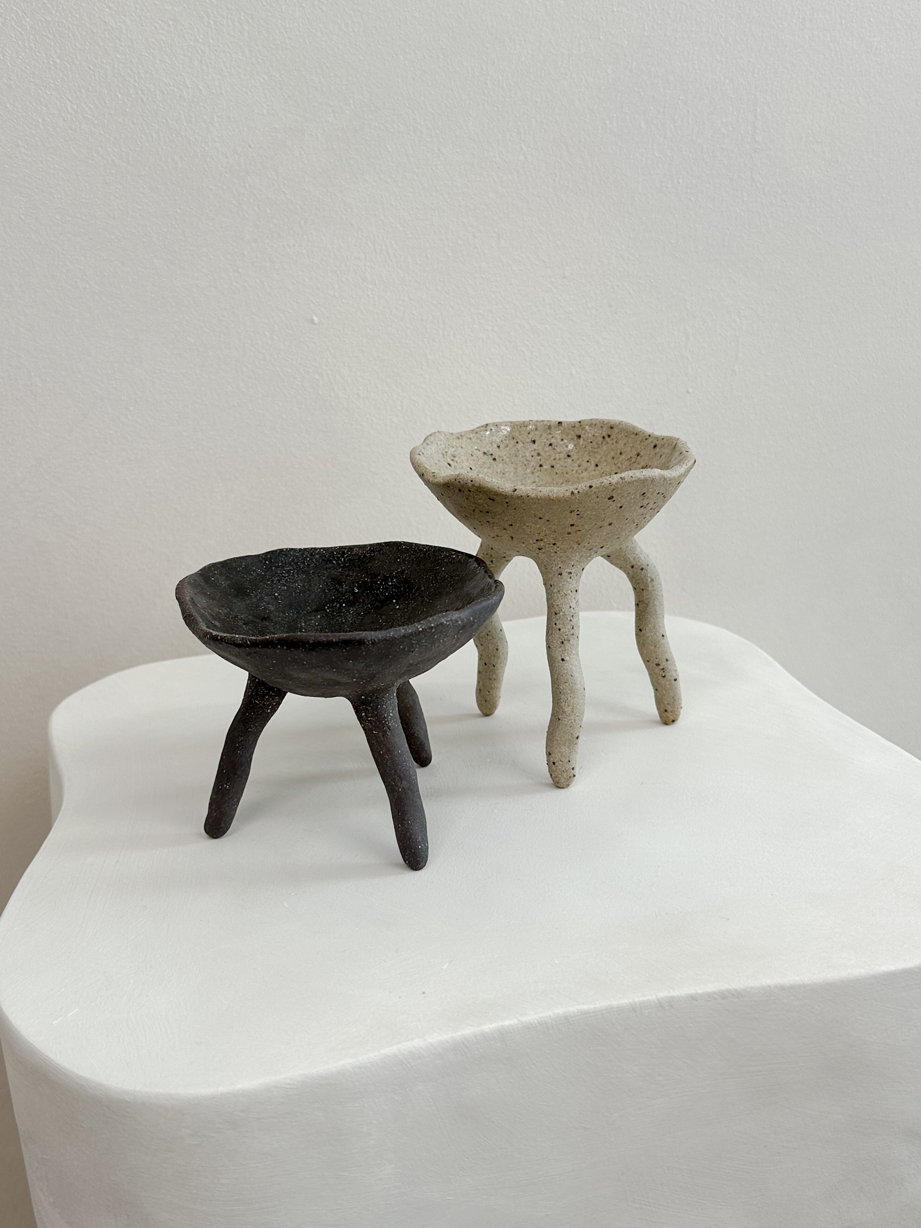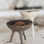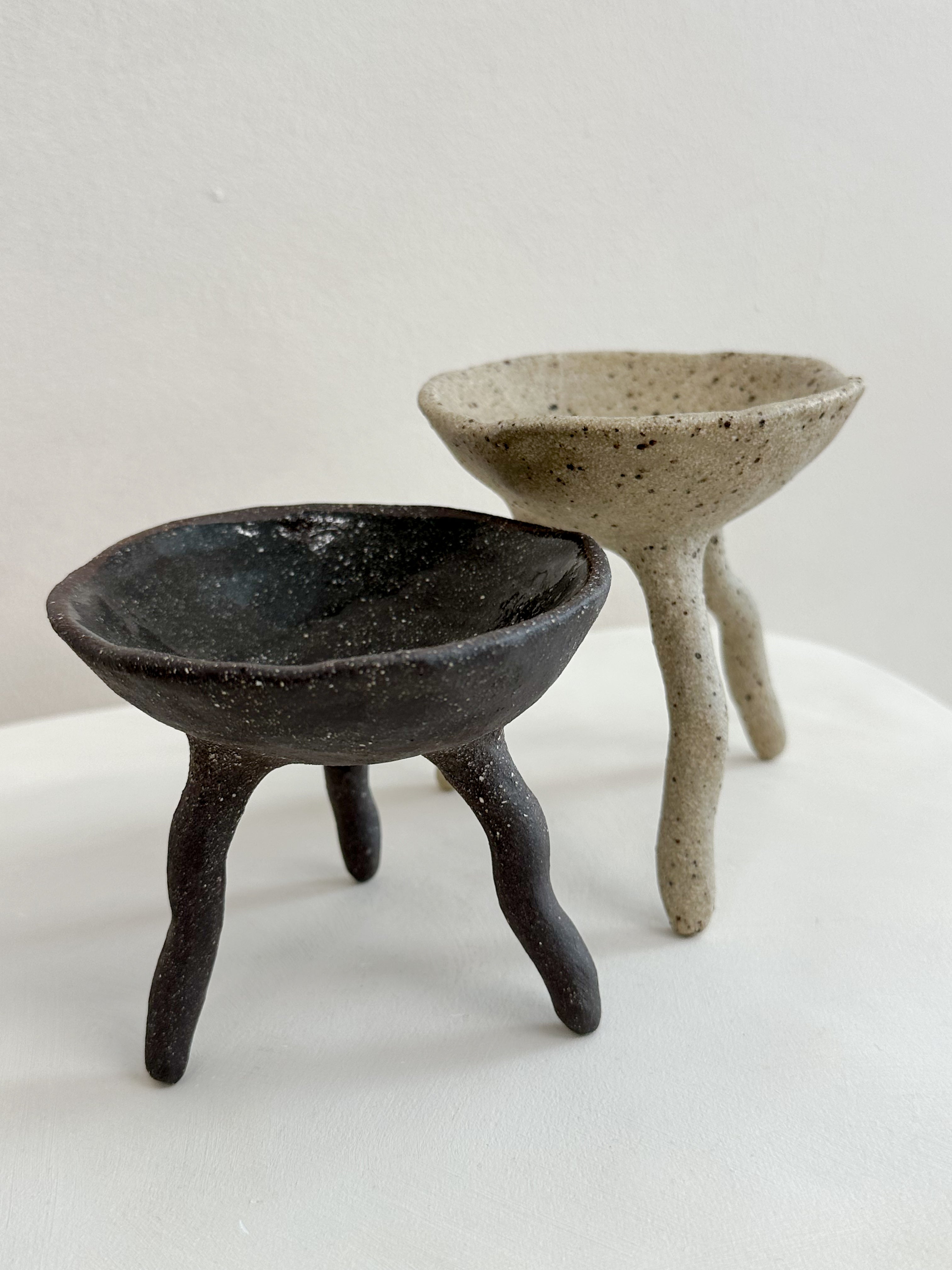 A set of two long footed pincher bowls - both created with a unique blend of multiple clay bodies to give their unique colour result. Each bowl is glazed internally with a clear gloss glaze, suitable for food. From salt and pepper pinchers, to serving ware, this pair have many uses.