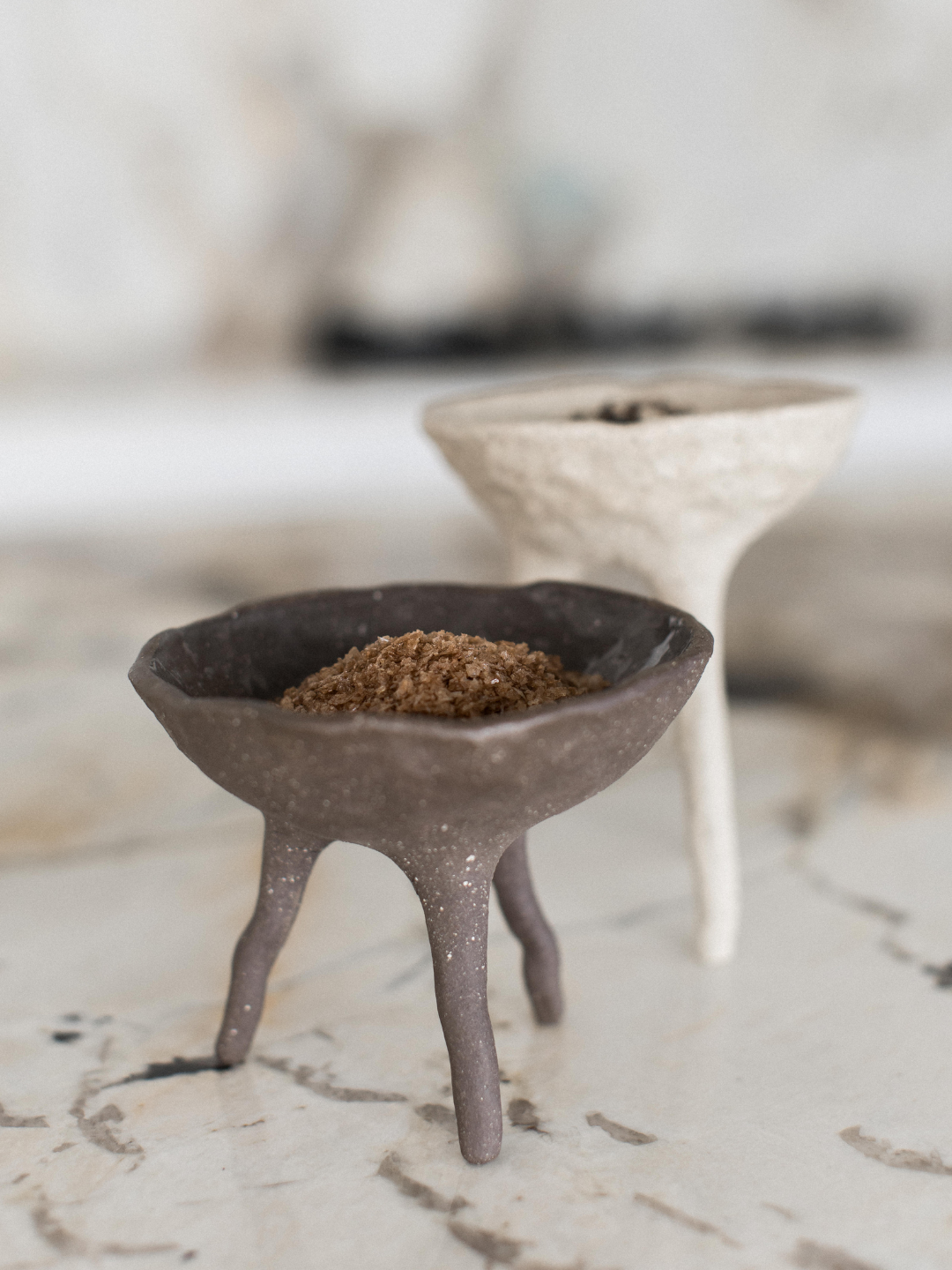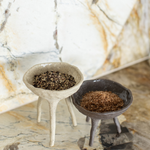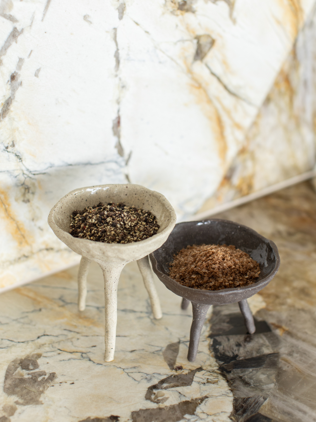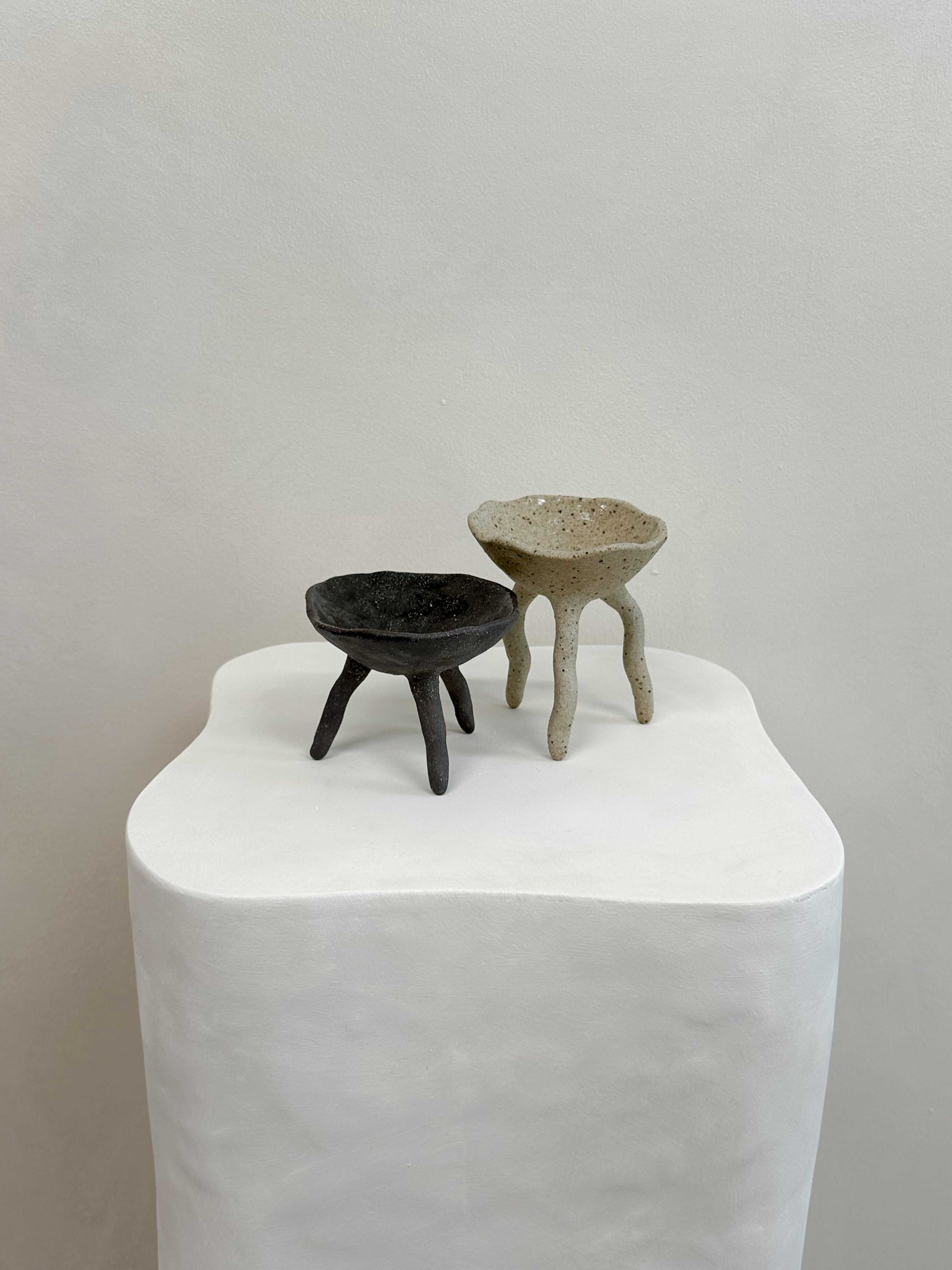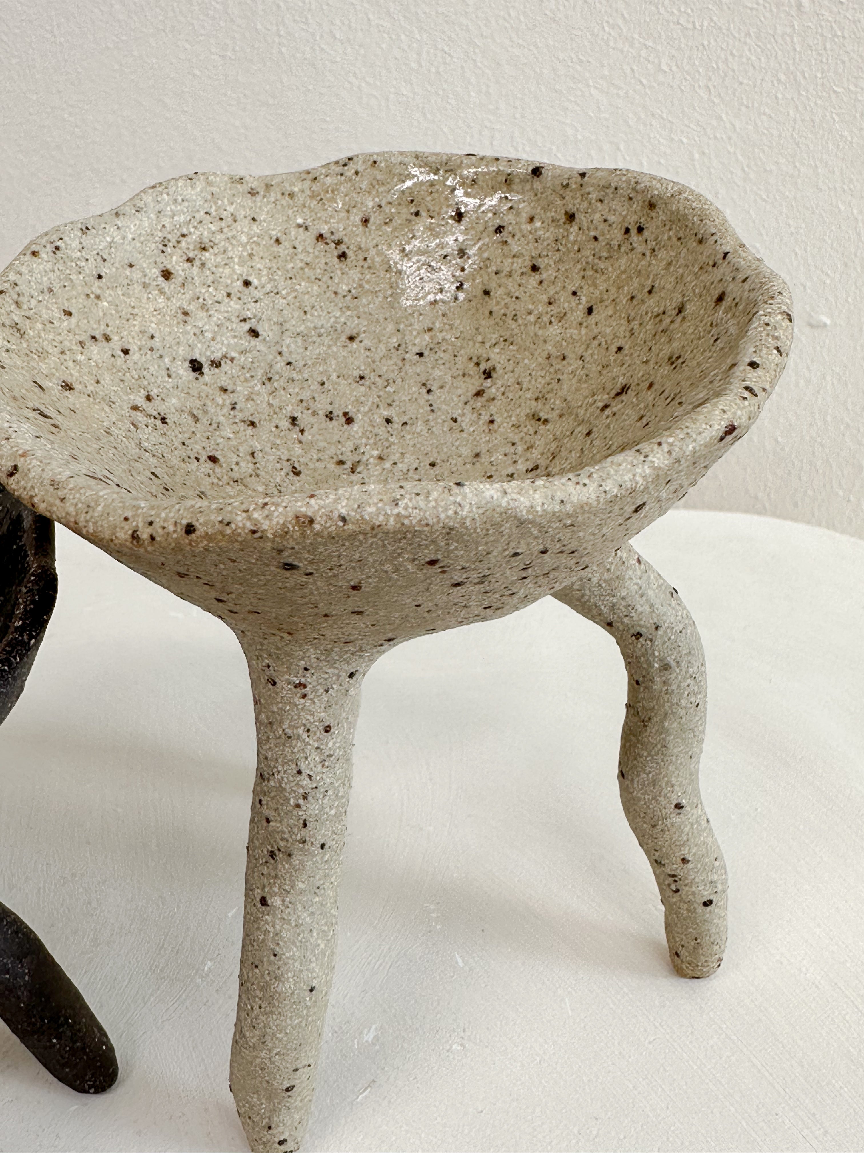 A set of two long footed pincher bowls - both created with a unique blend of multiple clay bodies to give their unique colour result. Each bowl is glazed internally with a clear gloss glaze, suitable for food. From salt and pepper pinchers, to serving ware, this pair have many uses.