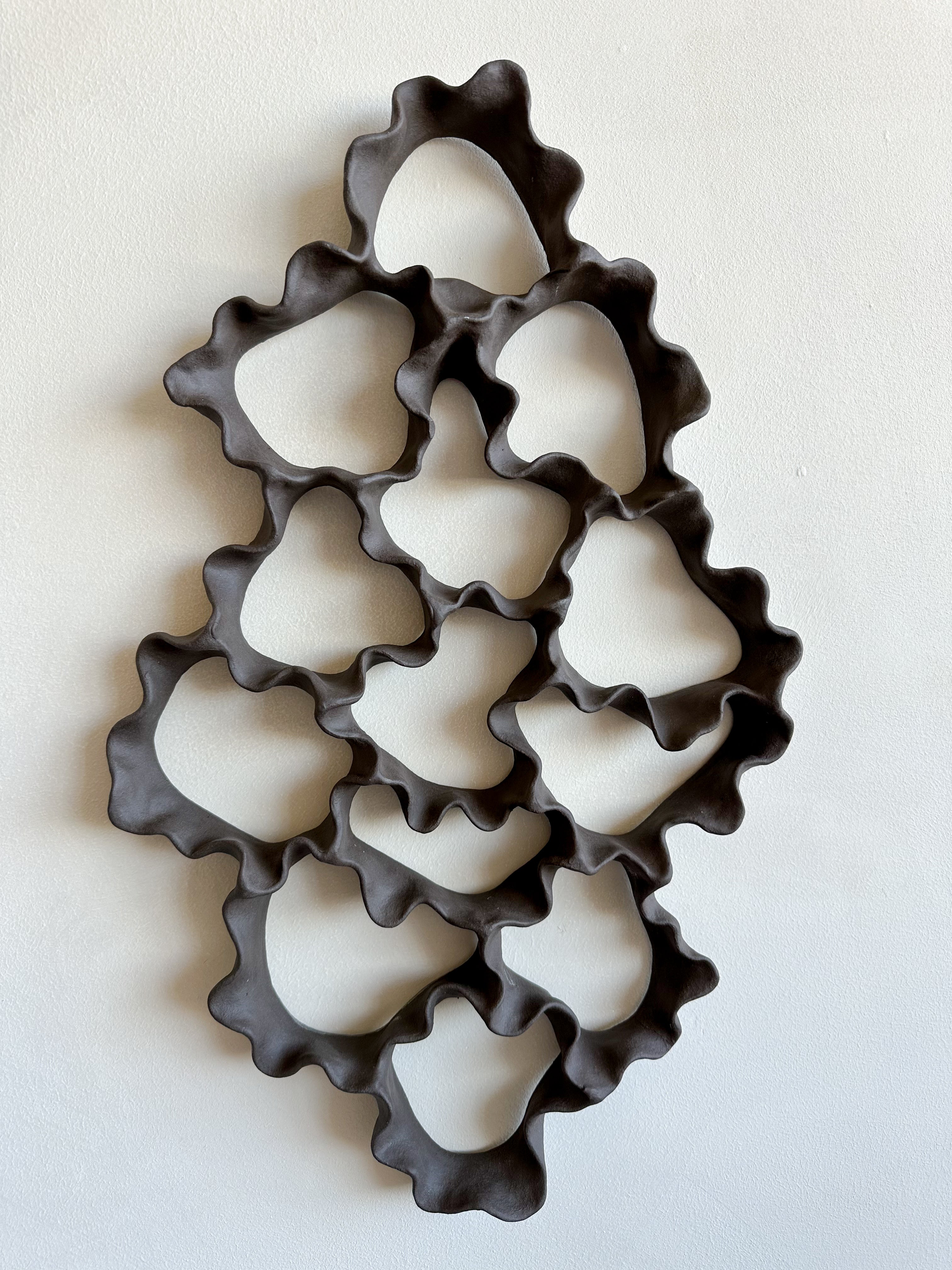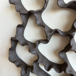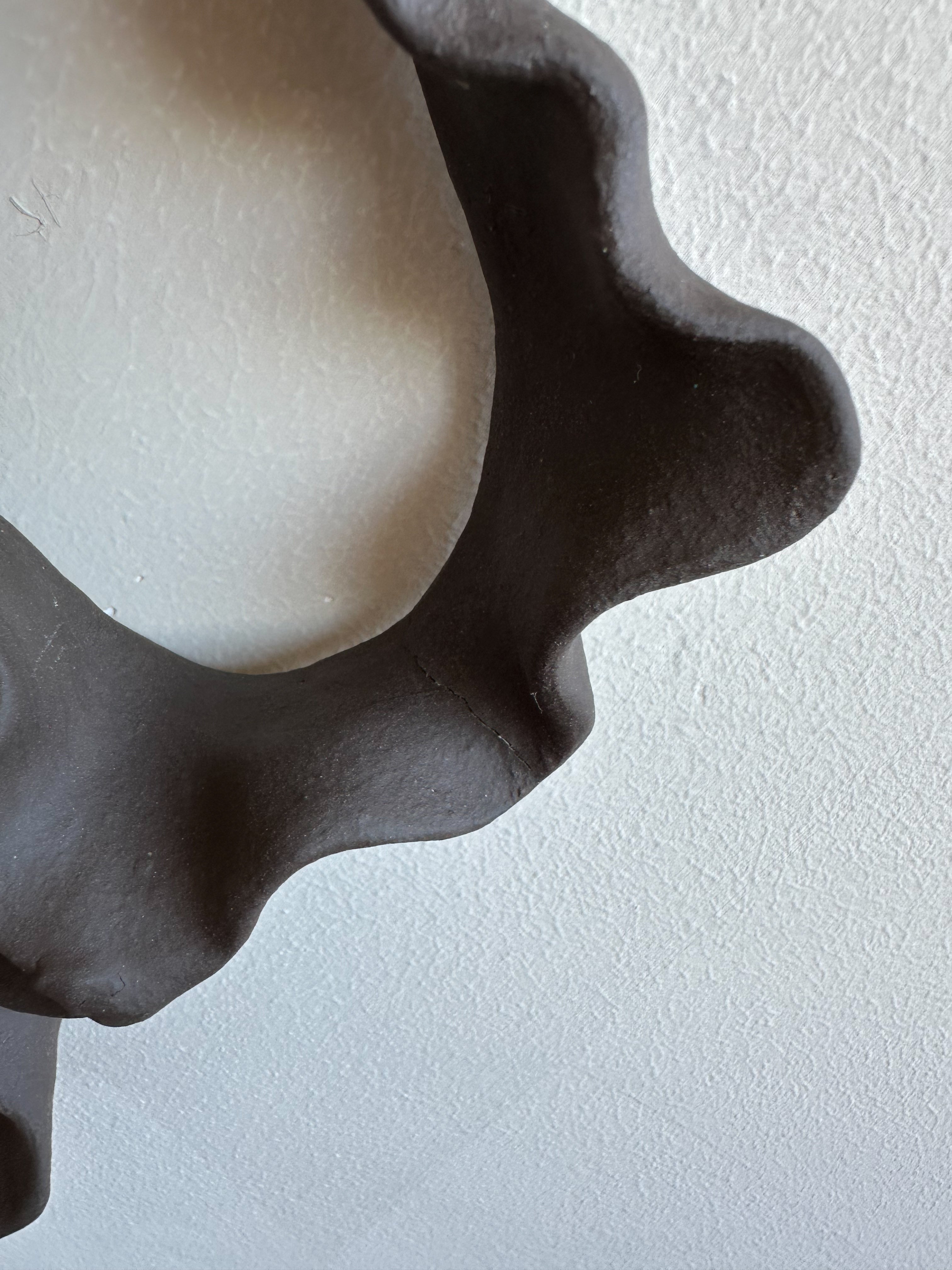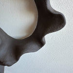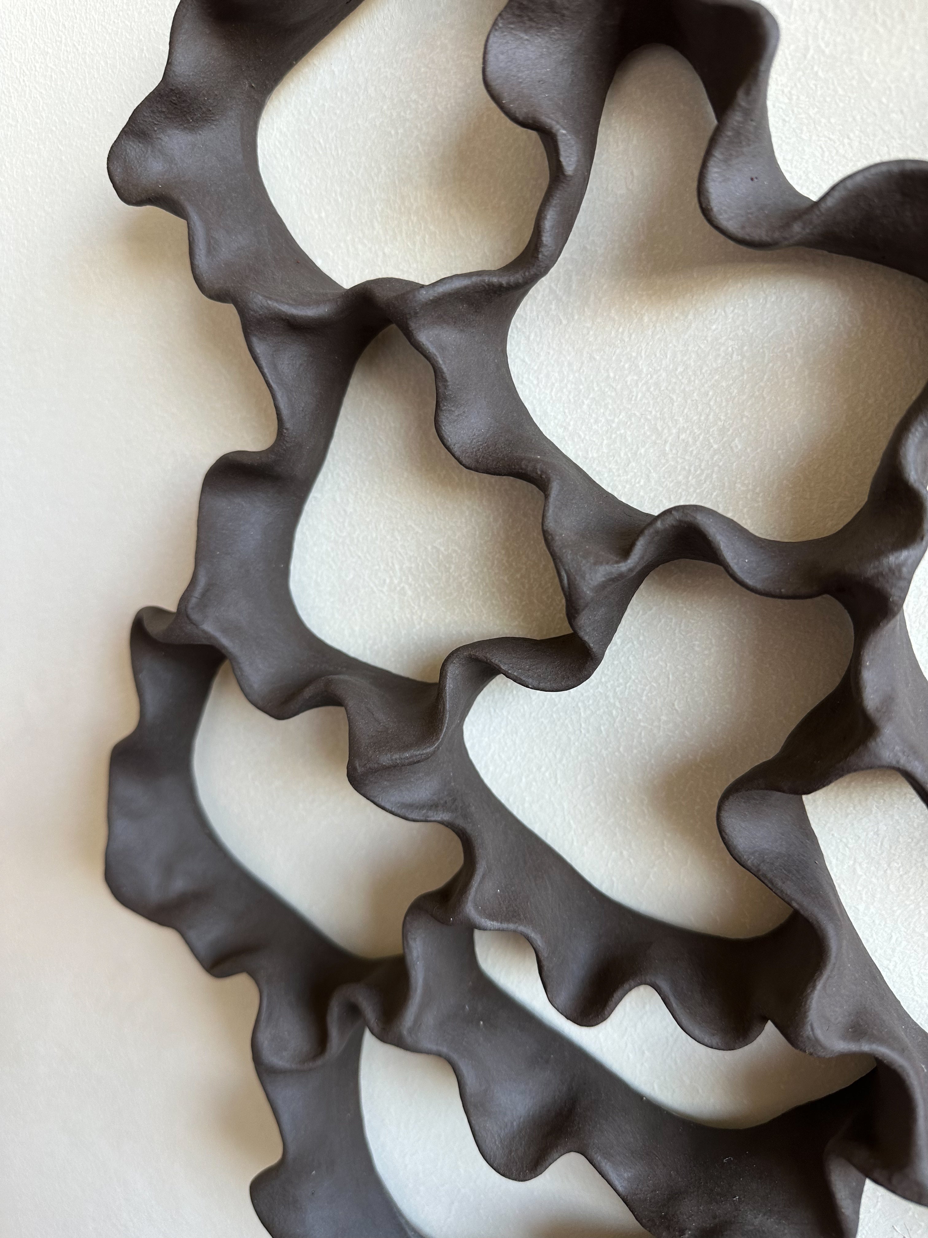 A ceramic wall sculpture in a rich matte dark brown, its organic, interwoven shapes create a play of light and shadow that draws the eye inward. The form carries a quiet sense of movement and balance, evoking depth and stillness in equal measure.