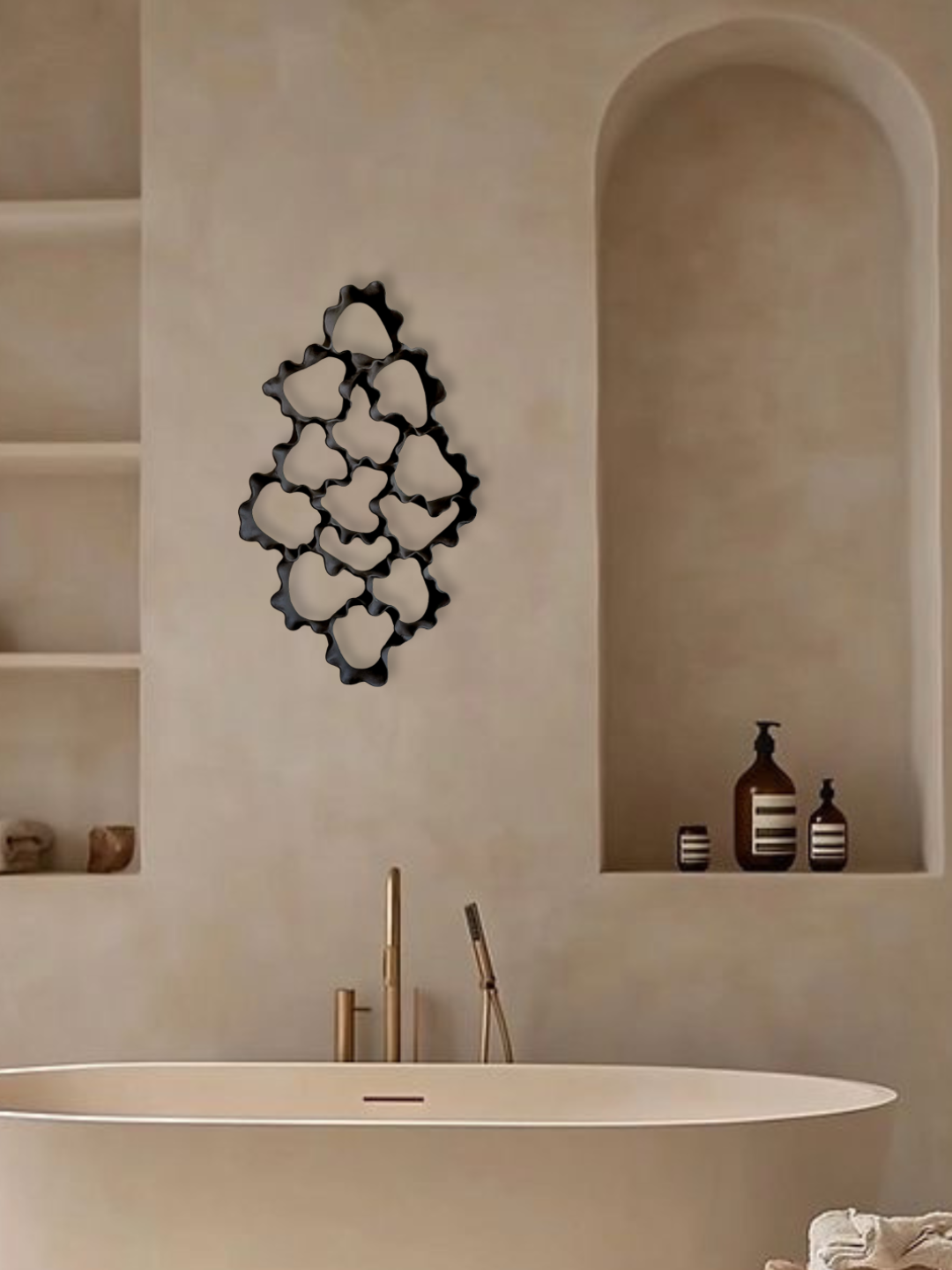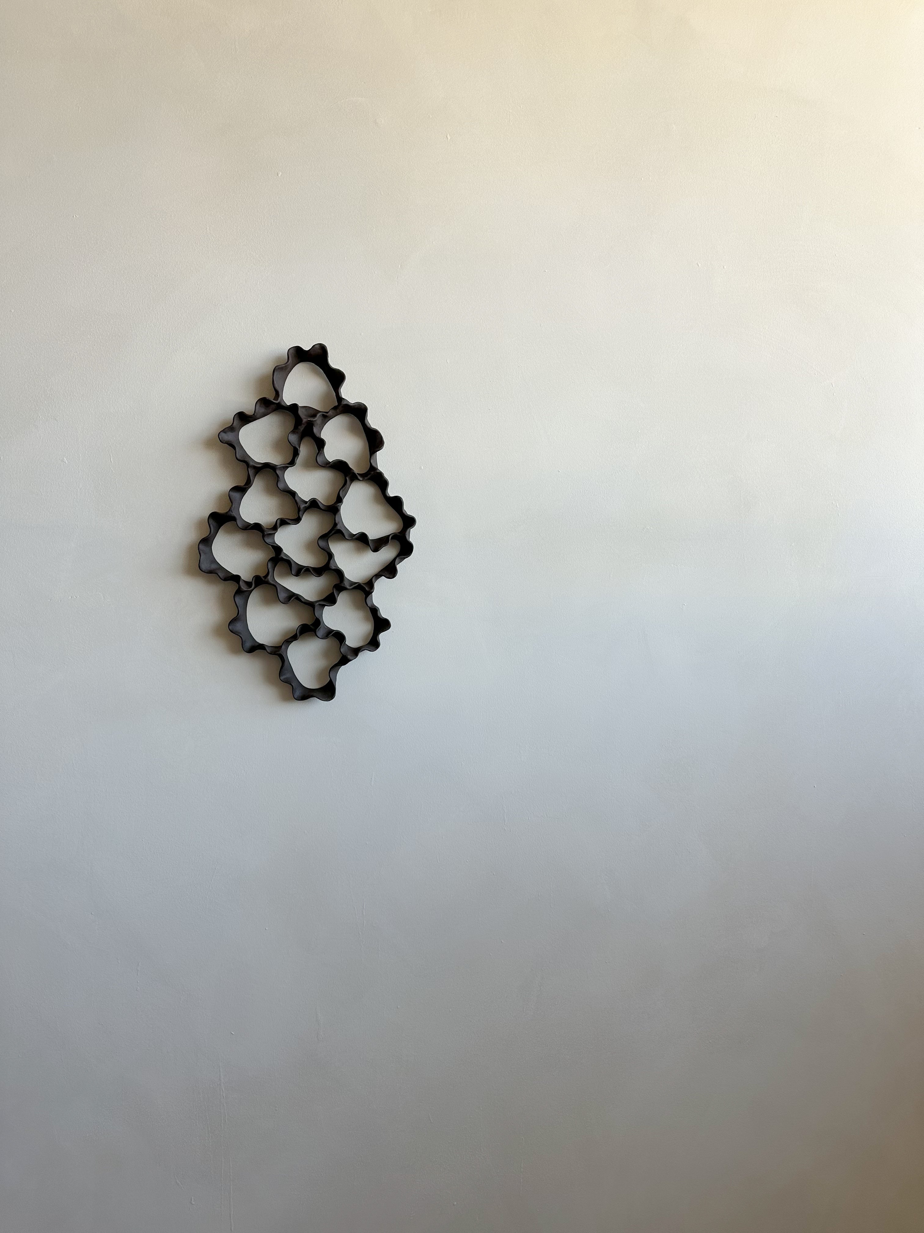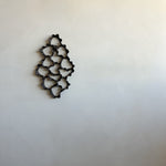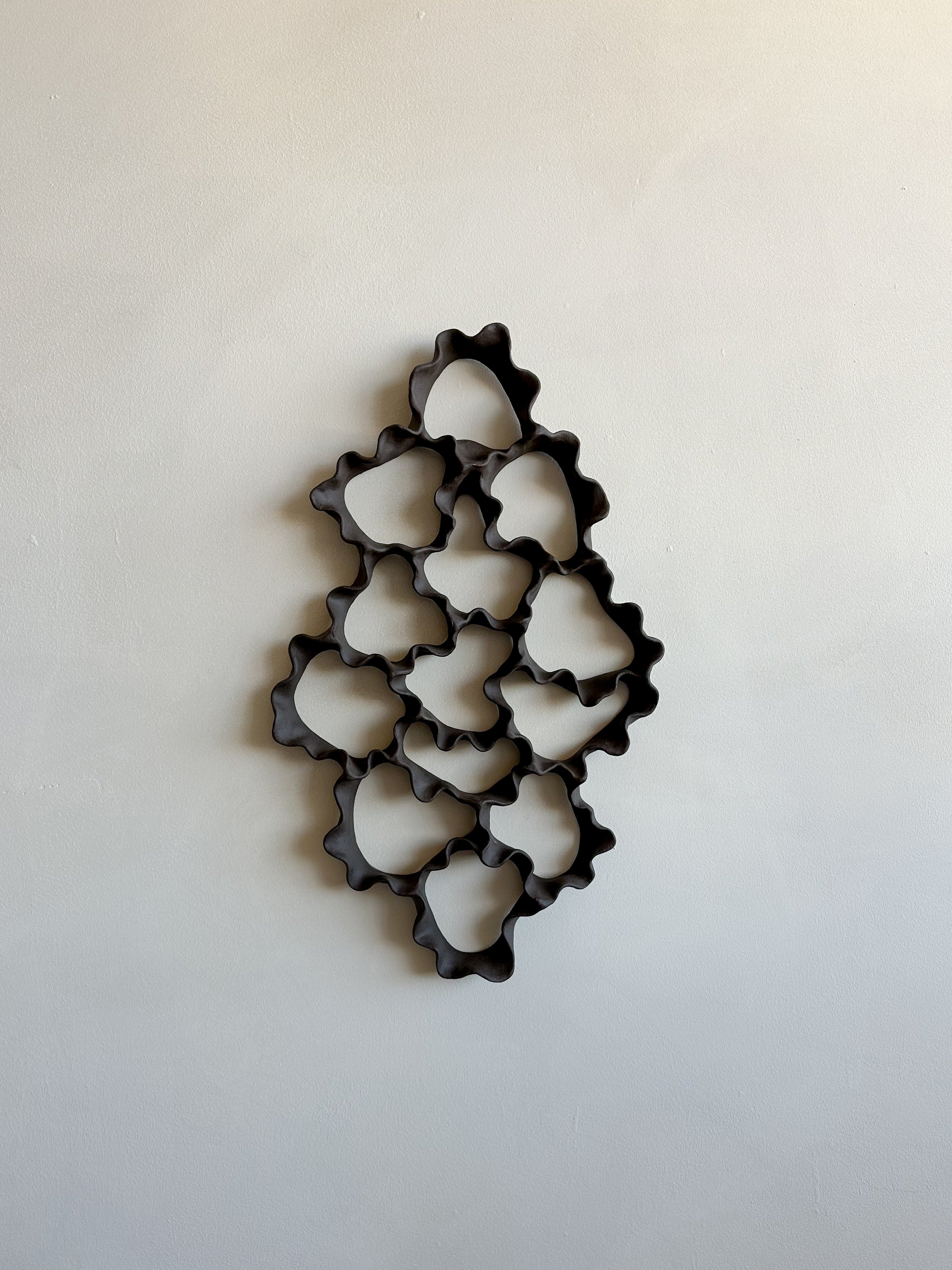A ceramic wall sculpture in a rich matte dark brown, its organic, interwoven shapes create a play of light and shadow that draws the eye inward. The form carries a quiet sense of movement and balance, evoking depth and stillness in equal measure.