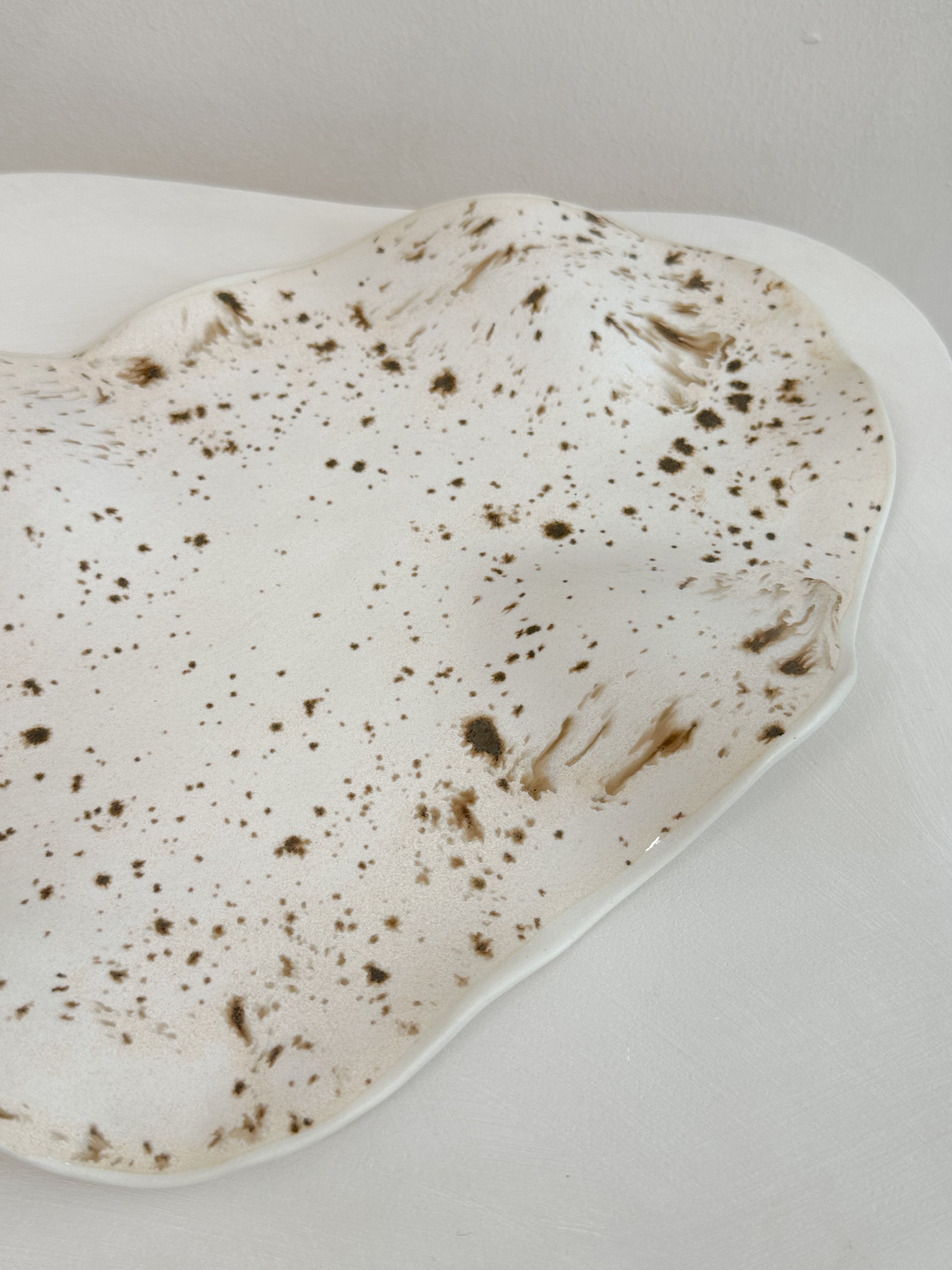 This Rock Pool Platter has been hand-crafted using a smooth white clay body and glazed with a glossy warm natural earthy glaze with large charcoal speckles.