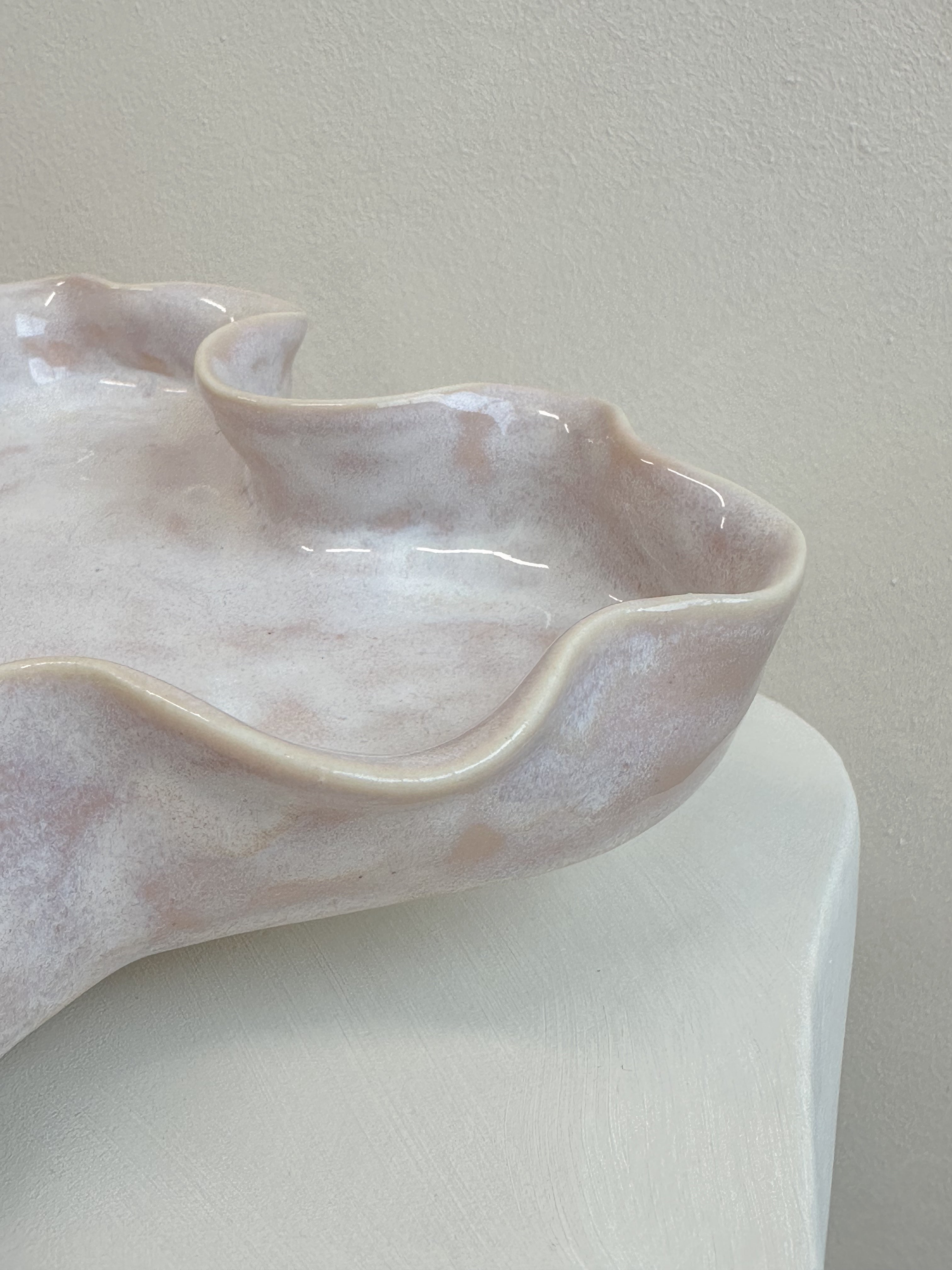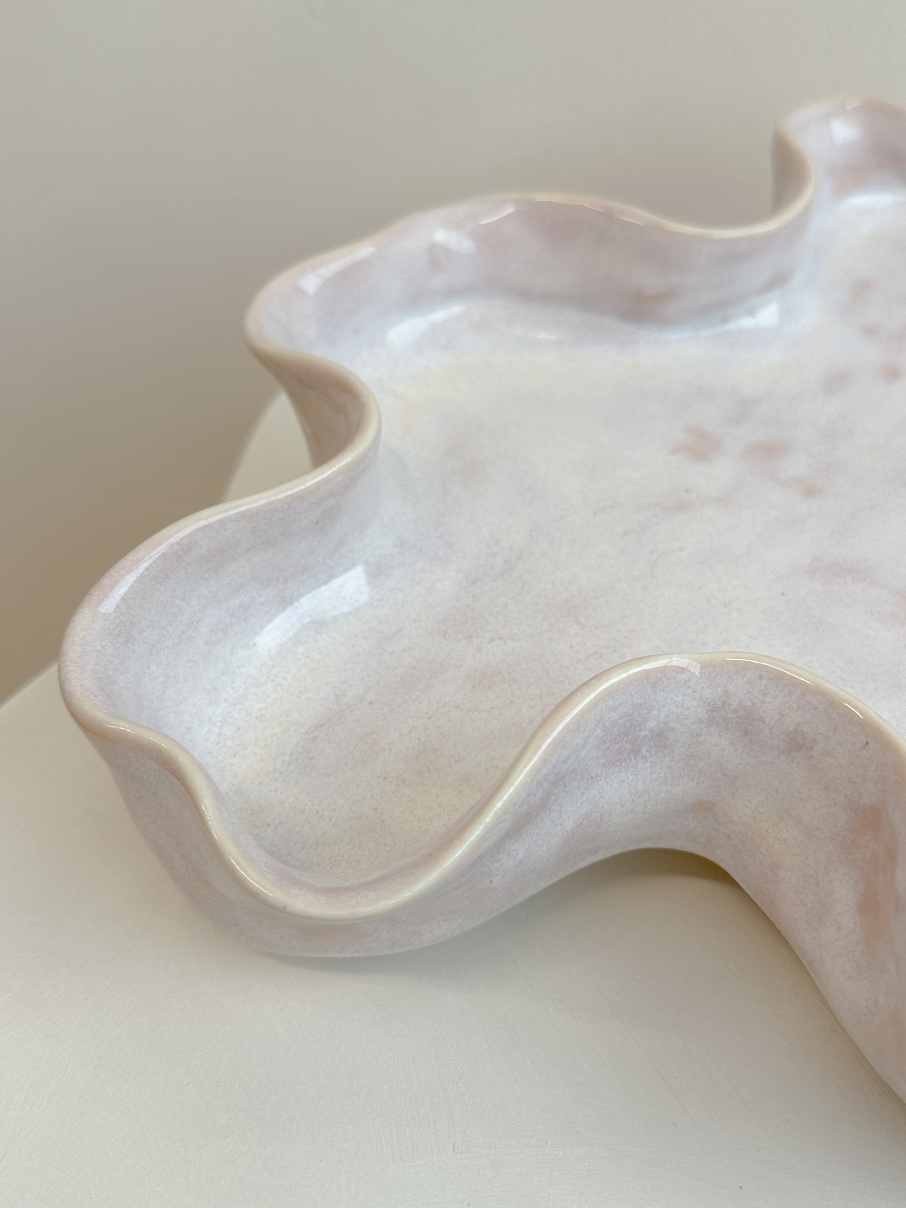 This On the Rocks Oyster Platter has been hand crafted with a smooth white clay body and glazed layers of different glazes giving the appearance of a seafoam covered sunset.
