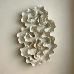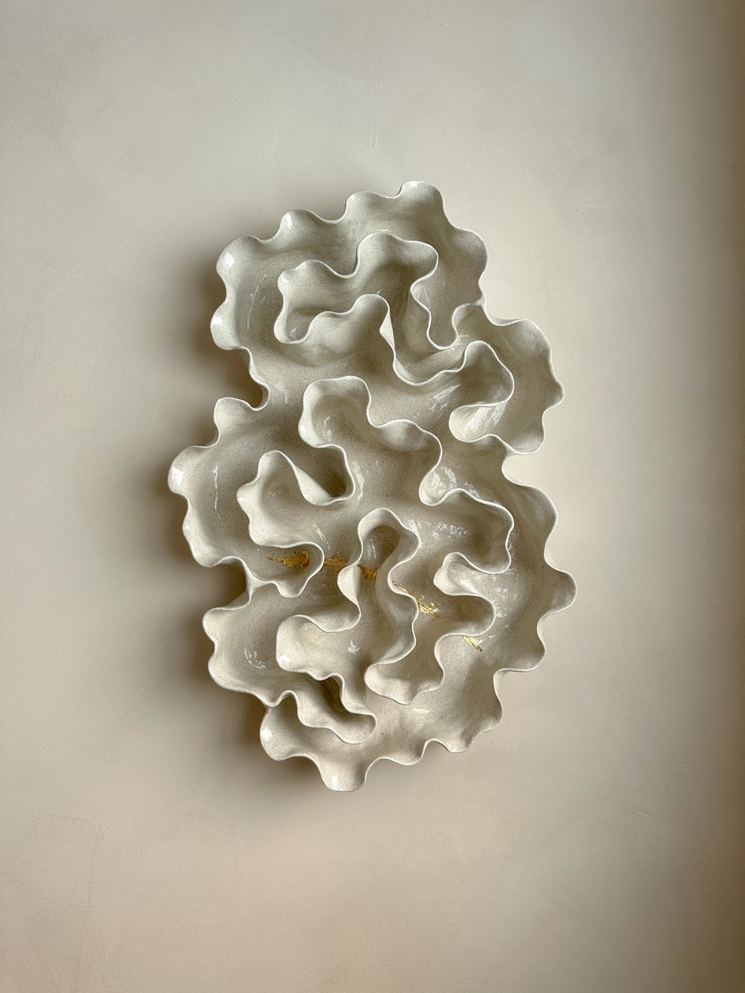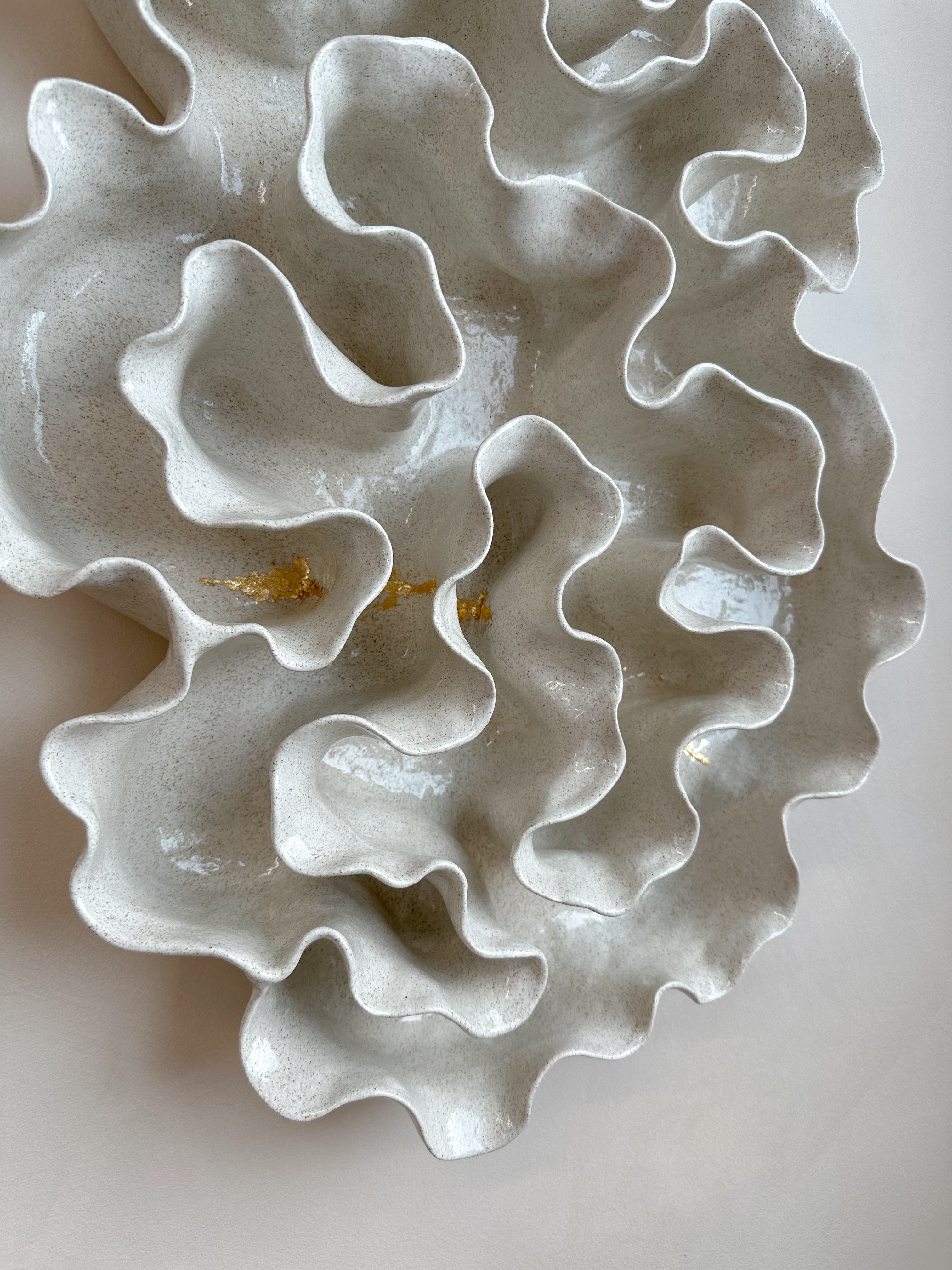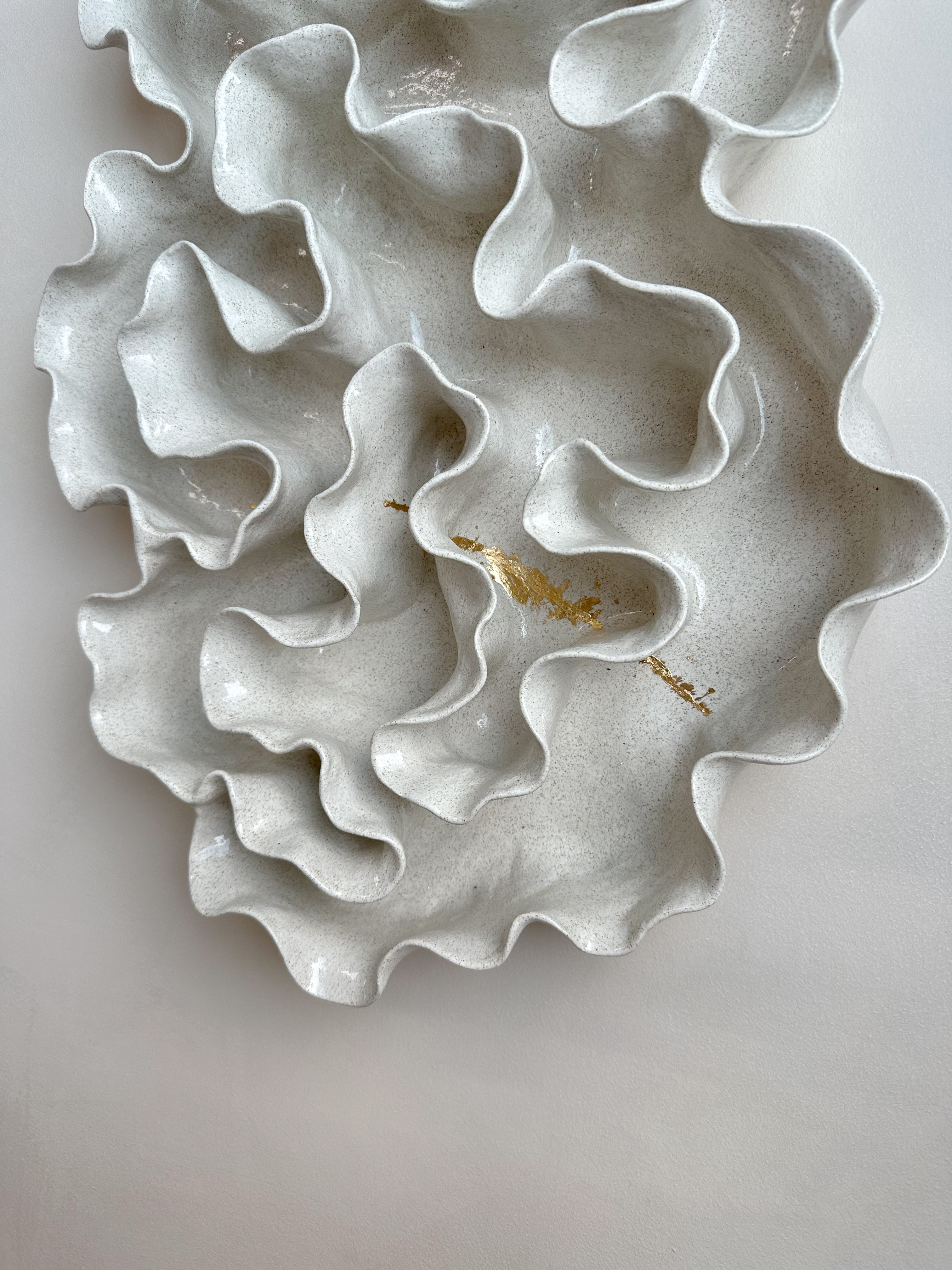A ceramic wall sculpture created with a textured white clay body and glazed with a glossy warm white speckle. When crafted with wet clay, this piece was almost 70cm and due to the sheer size of the piece, the clay became stressed and cracked on the back, showing through slightly on the front. The crack has been filled and gold leaf applied to the crack, creating a scar. The scar tells the story of pressure and tension, yet is still beautiful.