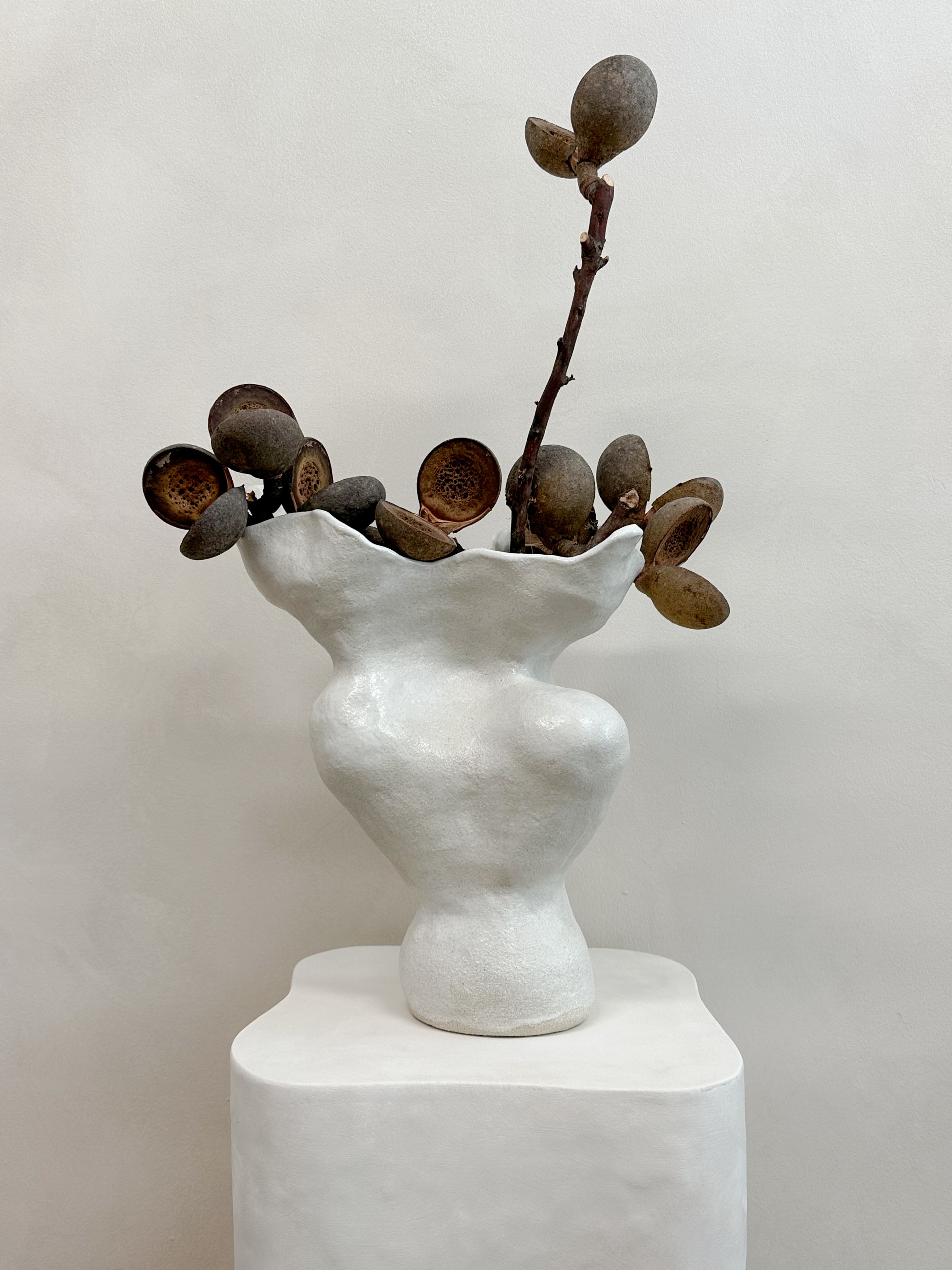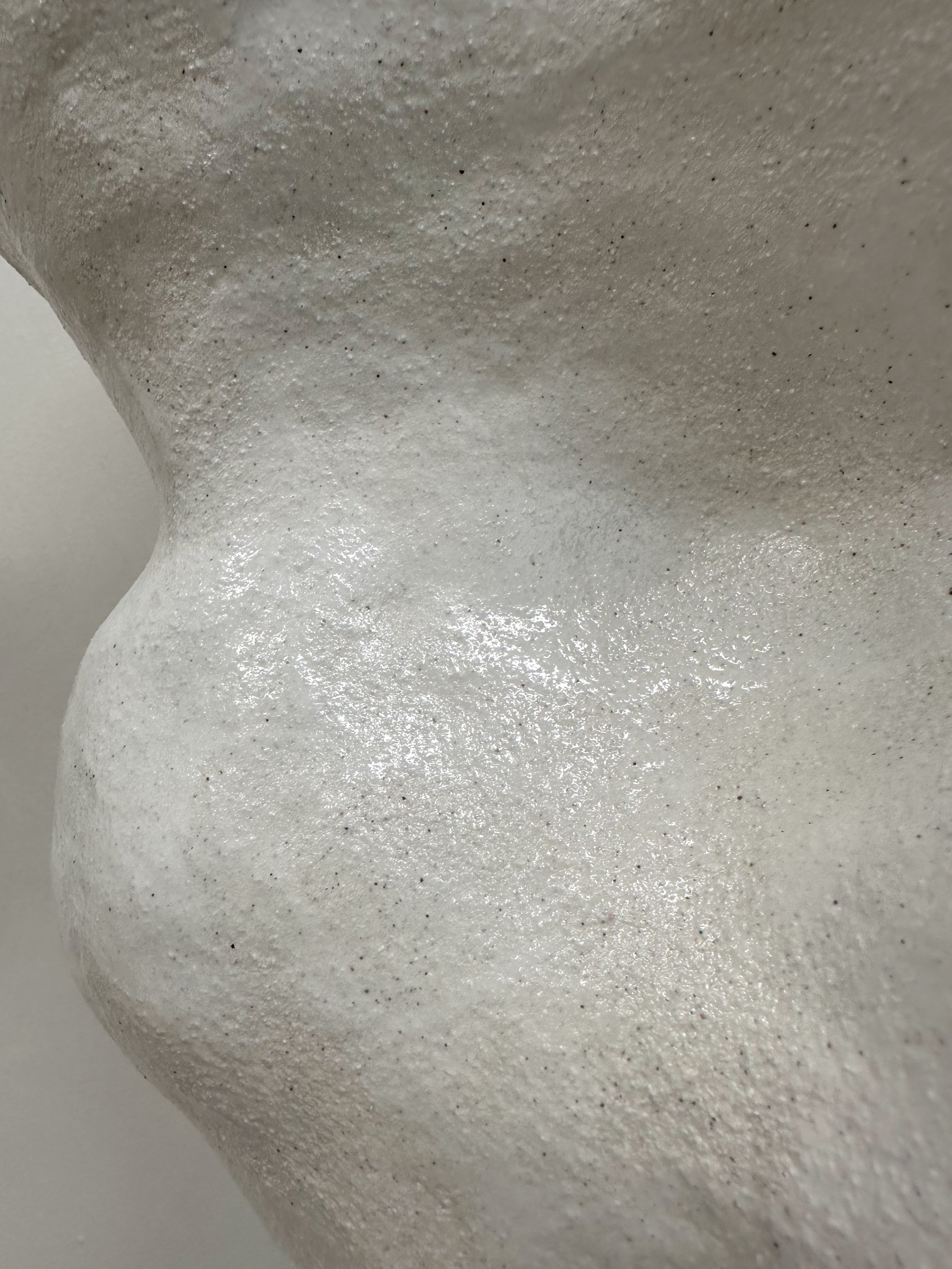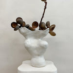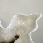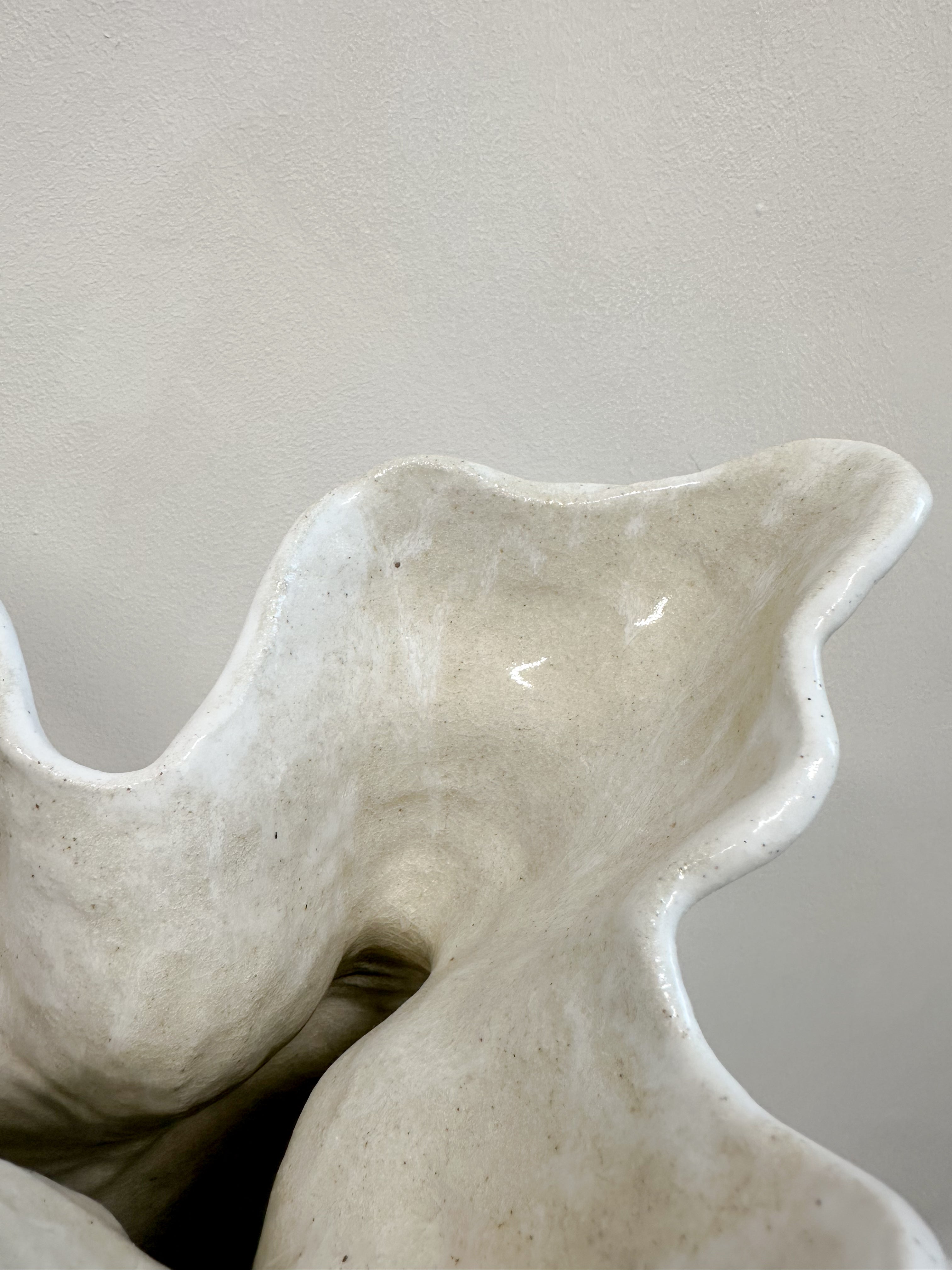 Hand-built with the coiling technique using a textured, warm white clay body, this sculptural vessel embodies balance, movement and femininity. Its organic silhouette is glazed on the exterior using a white glaze with a clear and white interior. Not suitable for wet arrangements.